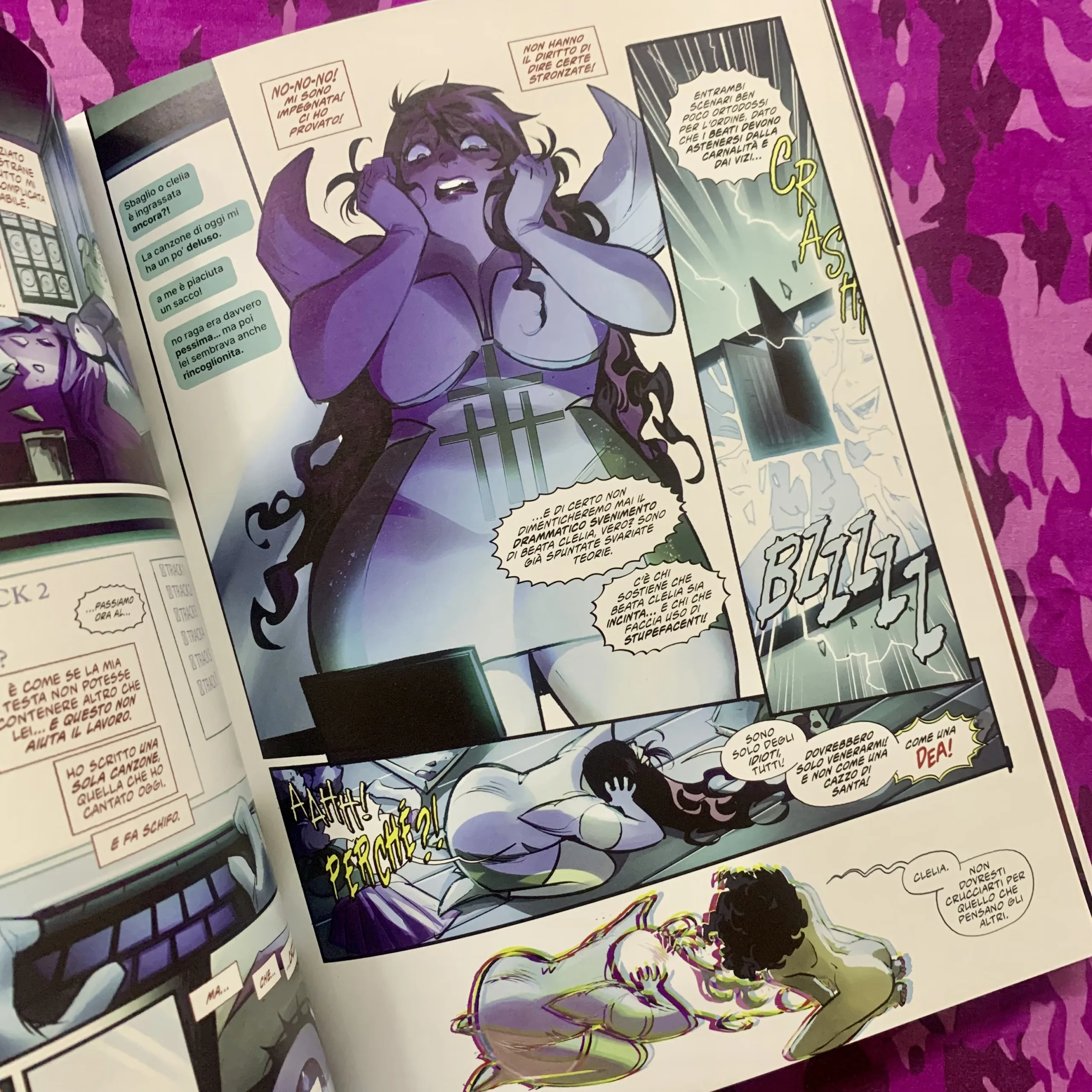 Sarà molto importante, perché Clelia praticamente per tutta la vita ha raccontato una bugia, lei vive una grande bugia. C’è un mistero dietro la chiesa per cui lavora che non svelo, ma praticamente lei non è come sembra e per lei vivere con questa bugia significa rinunciare alla vera se stessa. Questo ad un certo punto le ha creato una crisi, ha creato un conflitto con se stessa. Lei doveva vivere tra l’ossessione di farsi amare ed essere accettata dai suoi fan e followers, e il voler essere quello che è, che le piace. Questa cosa fa partire tutta la storia, quindi ci saranno degli sviluppi molto importanti nei prossimi volumi e vedremo come lei riesce a ritrovare se stessa.