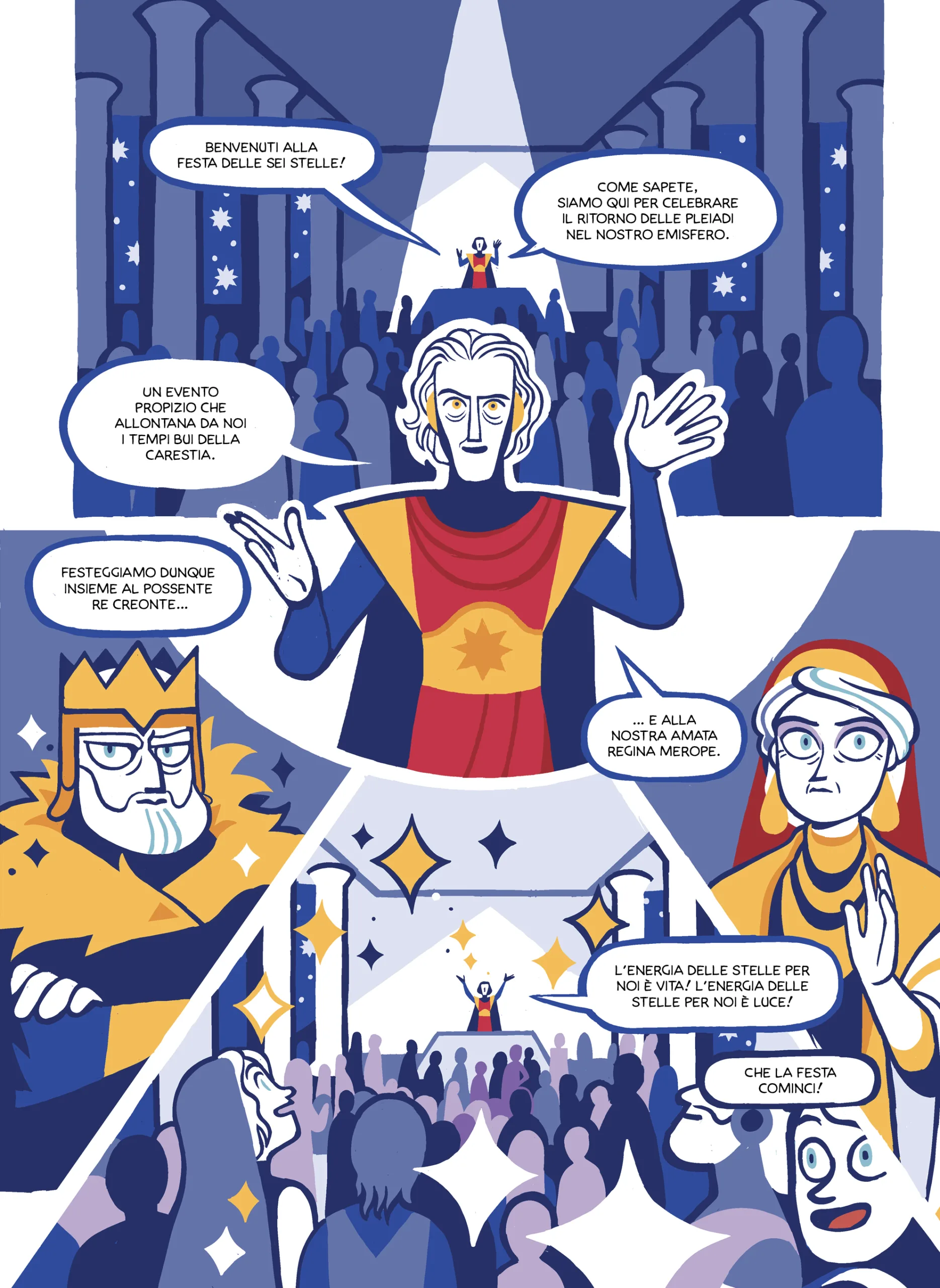 Questo libro è stato una liberazione. Da tempo avevo voglia di gestirmi tanto nella tavola quanto nella storia dettando le mie regole. Questo vale anche per i colori. Amo lavorare con una palette limitata, perché mi spinge a trovare modi coerenti ed essenziali per raccontare con le immagini. Per questa storia sono partita da un colore, il giallo, perché volevo che Medea avesse degli elementi che evocavano un’armatura e poi era importante anche per il Vello d’oro, dopo il giallo sapevo che il rosso doveva essere presente nella palette per via delle scene più violente, a quel punto ho scelto il blu dello spazio. Medea e gli abitanti di Colchis dovevano essere lilla inizialmente, ma poi ho optato per il turchese. La cosa più stimolante di questa palette, è stata evitare il nero, e trattarlo come un effetto speciale.
