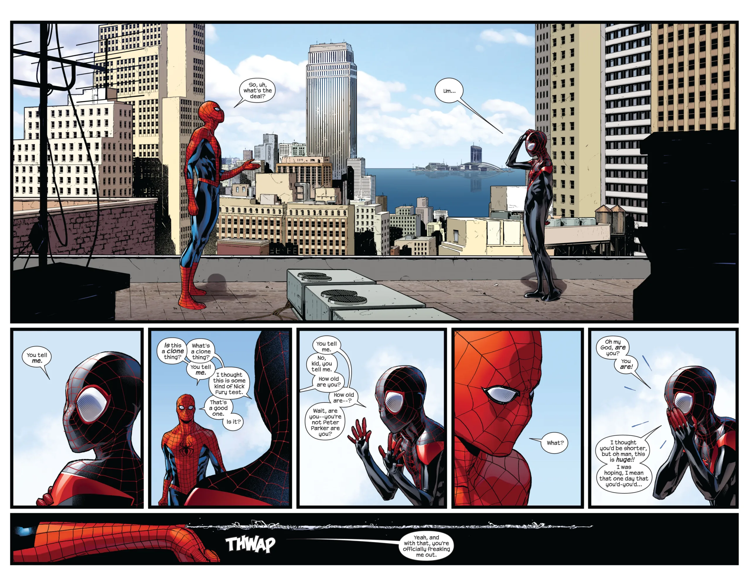 In realtà, la co-creazione del personaggio l’ho vissuta come un normale progetto. Vedevo in qualche modo un margine di azzardo perché si stava raccontando la morte di Ultimate Peter Parker e la sua sostituzione con un altro eroe, quindi un pochino di ansietta c’era. Ma probabilmente nessuno poteva immaginare quello che poi sarebbe diventato Miles. Io, Brian e tutto il team Marvel, compreso Joe Quesada, vedevamo la portata innovativa e la potenza del personaggio e la storia ci piaceva. Secondo me, era il momento giusto sotto tanti punti di vista. Forse la Marvel aveva visto più lungo di noi, ma questo è difficile dirlo, è sempre una scommessa, ma non penso che immaginassero di avere un instant classic tra le mani.