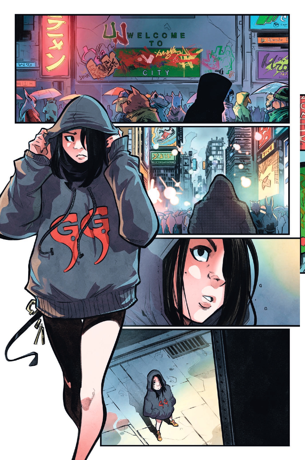 Con New Taste, Vincenzo Mirra sceglie di gettarci subito in uno scenario del quale non sappiamo nulla. Una città fuori dal tempo e dallo spazio, che appare contemporanea ma al contempo con forti vibes anni ’80, a partire dal momento in cui la protagonista entra in un negozio di video noleggio pieno di vhs, ormai pressoché estinti (ahimé) ma che i lettori meno giovani potranno guardare con nostalgia. Un mondo dove vivono creature antropomorfe e dall’atmosfera molto cupa. Dopo una prima breve parte più lenta, arriva il giorno della fuga e dall’incontro tra i due protagonisti la storia inizia ad accelerare e i giri del motore salgono, con scene d’azione sempre più sfrenate e appassionanti. All’inizio non è dato sapere chi siano la ragazza e il suo pilota, ma con il passare delle pagine iniziamo a conoscerli meglio e a esplorare il loro carattere.
