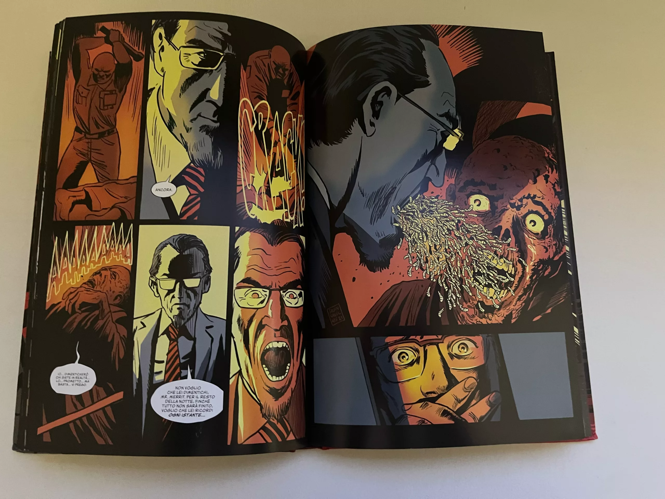 A proposito dei disegni comunque, il buon Francavilla fa un lavoro incredibile. Uno stile perfetto per i temi trattati nel volume. L’utilizzo del nero, del rosso e la caratterizzazione dei personaggi e delle atmosfere. Soprattutto nelle scene più splatter dà il suo meglio, realizzando delle tavole in cui l’orrore schizza fuori da ogni vignetta. Dalle splash page a quelle più normali, ogni tavola sarebbe da incorniciare.