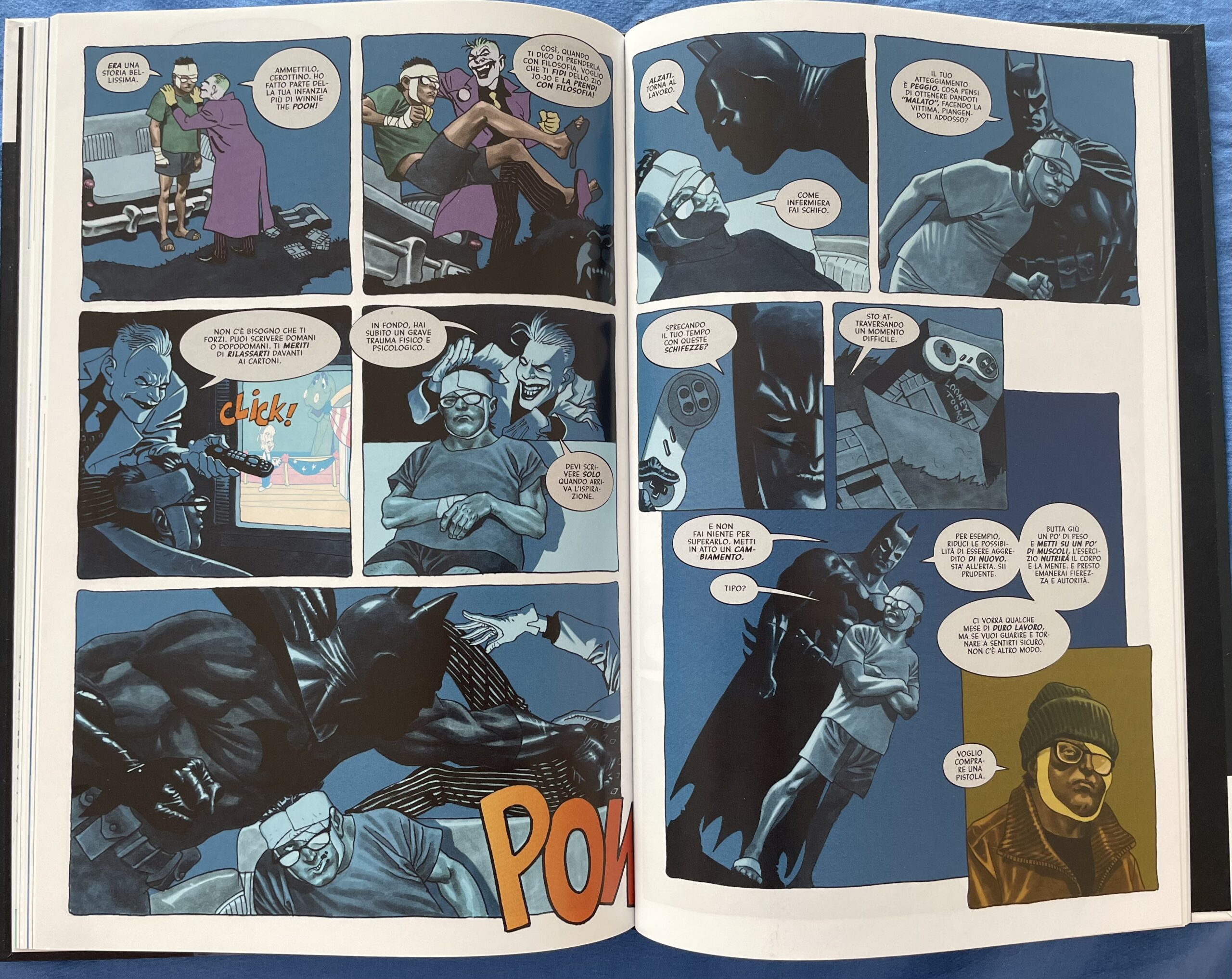 L’autore si racconta senza filtri, mettendo a nudo la sua mente e tutti i pensieri che si agitavano al suo interno in quei momenti difficili. Dov’era Batman quando lo stavano quasi uccidendo in strada? Avrebbe potuto intervenire e salvarlo in un attimo se avesse voluto. Da un certo punto di vista, sa che sono personaggi di finzione, ma hanno fatto così tanto parte della sua vita che si sente quasi tradito da loro. Il senso di impotenza che prova è enorme e lo spinge vicino alla decisione di abbandonare tutto quanto. Paul ha sempre vissuto nel mondo della finzione, più che in quello reale, e ora, in un momento difficile, è proprio da lì che può arrivare il colpo di grazia o la salvezza. Anche nella sua testa, il Cavaliere Oscuro continua la crociata contro i suoi nemici, come Joker, Harley Quinn e Poison Ivy, che vorrebbero portare Paul a sprofondare nella sua spirale di depressione, mettendo a nudo le sue debolezze e gli errori compiuti in passato. Una battaglia diversa da quelle a cui siamo abituati, che non si combatte tra le strade di Gotham, ma che mostra perfettamente il potere che possono avere le storie anche nel superare i drammi personali.