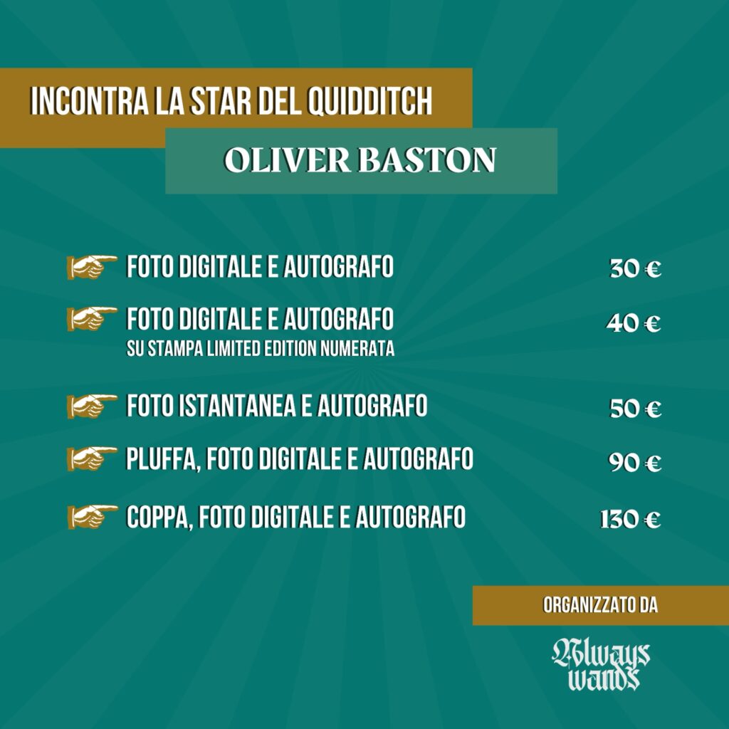 Tantissime sono le opzioni per immortalare per sempre l’incontro con il capitano della squadra di Grifondoro, Oliver Baston, dalla classica foto digitale ad una foto istantanea firmata, fino ad arrivare a poter possedere in esclusiva l’iconica Pluffa e la Coppa del Quidditch.