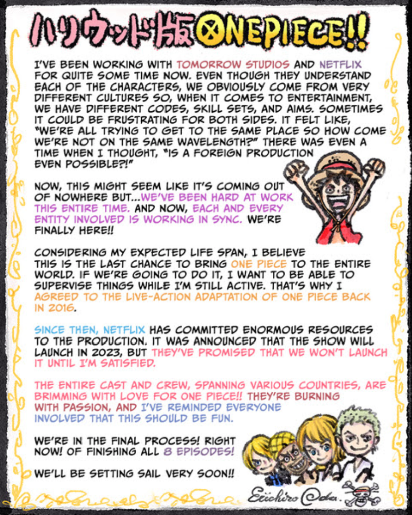 Non ci vorrà molto prima che One Piece sbarchi su Netflix, in un modo mai visto prima. Se non lo sapevate, Netflix sta lavorando duramente con i Tomorrow Studios e il creatore della serie Eiichiro Oda per trasformare l’anime in un film live-action. Il progetto è andato avanti con costanza da quando è stato annunciato e, naturalmente, i fan tengono d’occhio One Piece ora che la post-produzione sta andando avanti senza intoppi. Saranno quindi felici di vedere che lo stesso Oda ha pubblicato una nuova lettera sugli aggiornamenti della serie.