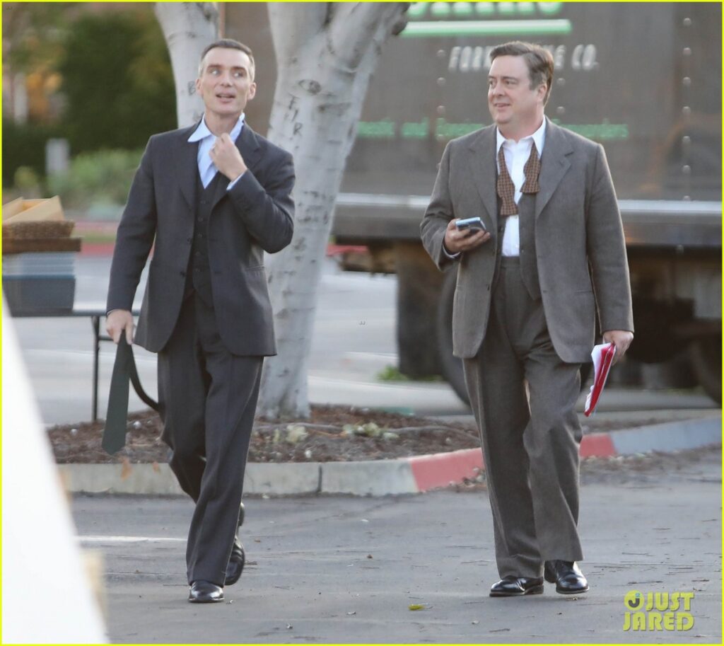 Cillian Murphy si mostra sollevato nel togliersi la cravatta mentre si allontana dal set, vestito con un caldo abito a tre pezzi color carbone che segue lo stile dell’epoca. Anche il regista, Christopher Nolan, non era vestito in modo troppo diverso dalle sue star, con un blazer nero ed un gilet grigio. Nolan ha coltivato una lunga relazione con Murphy, che è un membro regolare del suo gruppo di attori secondari. I due hanno lavorato insieme per la prima volta in Batman Begins del 2005 e Murphy è apparso nei suoi sequel Il Cavaliere Oscuro e Il Cavaliere Oscuro: il Ritorno. L’attore ha inoltre recitato nei film Inception e Dunkirk.