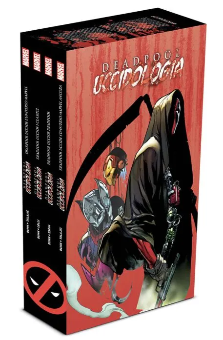 Infine, le quattro opere che compongono l’Uccidologia di Deadpool: la saga più amata e venduta di sempre firmata da Cullen Bunn e raccolte in un prestigioso cofanetto! Chiacchierone, degenerato, rigenerante e… killer, Deadpool è in rotta di collisione con l’intero Universo Marvel, e se la dovrà vedere, ancora e ancora, con tutti gli eroi e i criminali della Marvel, per poi passare (a fil di spada) ai classici della letteratura e infine a tutti i Deadpool del Multiverso.