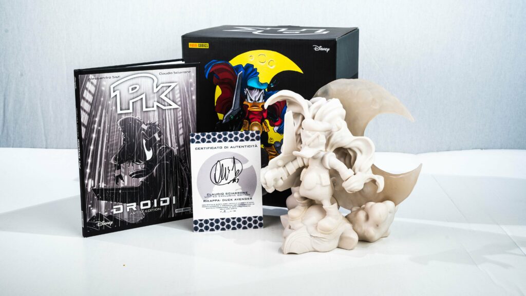 Su entrambi gli oggetti da collezione – in formato 21,7×23,5cm con profondità 16,3cm – è presente l’incisione sul fondo con la firma dell’autore, accompagnata dal certificato di autenticità numerato a mano (per l’Exclusive Edition, inoltre, il certificato ha la firma originale dell’autore). All’interno della box che racchiude la preziosa statua, poi, è contenuta anche una versione inedita di Droidi, avventura “pikappika” del 2018 firmata da Alessandro Sisti e Claudio Sciarrone, a cui si unisce il making of della statua.