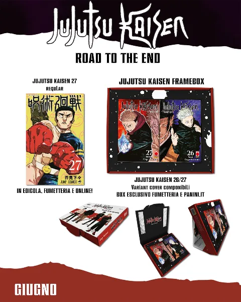 Si parte con Jujutsu Kaisen – Sorcery Fight 27: Sukuna è inarrestabile: per fermare il rivale Kashimo esegue una tecnica di devastante potenza, ma il prezzo da pagare è molto alto. Nel frattempo, Kenjaku viene sfidato da un avversario inaspettato in un combattimento… all’ultima risata? Oltre alla versione regular (disponibile in edicola, fumetteria, libreria e online), il volume, in arrivo a giugno, è presentato anche all’interno del Jujutsu Kaisen Frame Box: un cofanetto che include i numeri 26 e 27 in edizione variant cover, con copertine componibili, esclusive e disponibili solo all’interno del box, che si trasforma in una cornice per esporle affiancate! Disponibile in fumetteria e su panini.it.