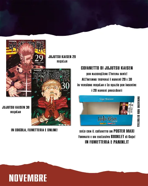 I due volumi (29 e 30 in edizione regular) potranno essere acquistati anche all’interno di un cofanetto progettato per raccogliere l’intera serie. In allegato come esclusive del cofanetto anche un poster maxi formato e un esclusivo booklet di Gojo.