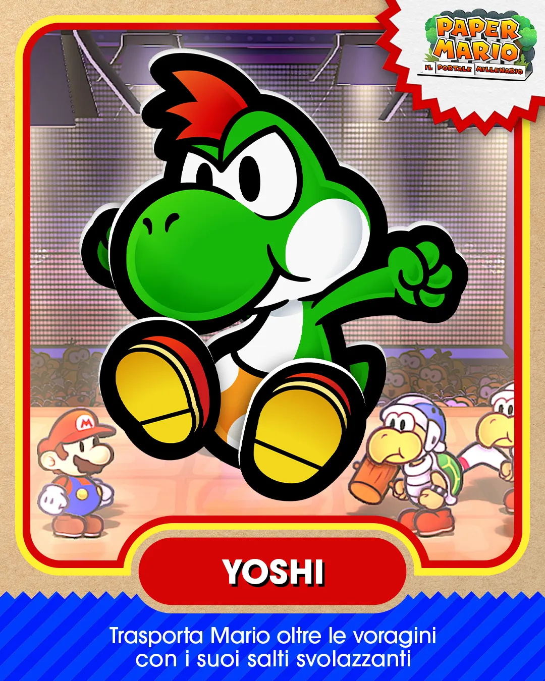 La grande annata di Mario e Nintendo continua con l’arrivo di un nuovo remake Paper Mario: Il Portale Millenario! Il secondo titolo della serie Paper Mario vedrà Mario alla ricerca delle Gemme Stella per aprire il Portale Millenario e liberare così la principessa Peach dagli Incrociati. Mario, esattamente come in Super Mario RPG, sarà aiutato da diversi e unici compagni, ognuno con la propria storia e le proprie abilità. Andiamo a scoprirli insieme a uno a uno, parlando di un grande amico di Mario: Miniyoshi.