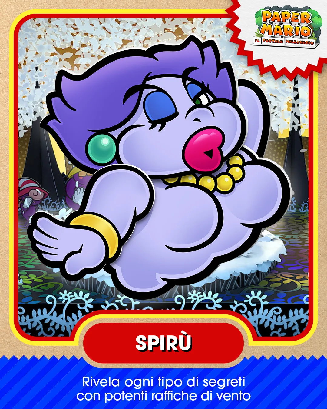 La grande annata di Mario e Nintendo continua con l’arrivo di un nuovo remake Paper Mario: Il Portale Millenario! Il secondo titolo della serie Paper Mario vedrà Mario alla ricerca delle Gemme Stella per aprire il Portale Millenario e liberare così la principessa Peach dagli Incrociati. Mario, esattamente come in Super Mario RPG, sarà aiutato da diversi e unici compagni, ognuno con la propria storia e le proprie abilità. Andiamo a scoprirli insieme a uno a uno, ora tocca a un grande spirito: Spirù.