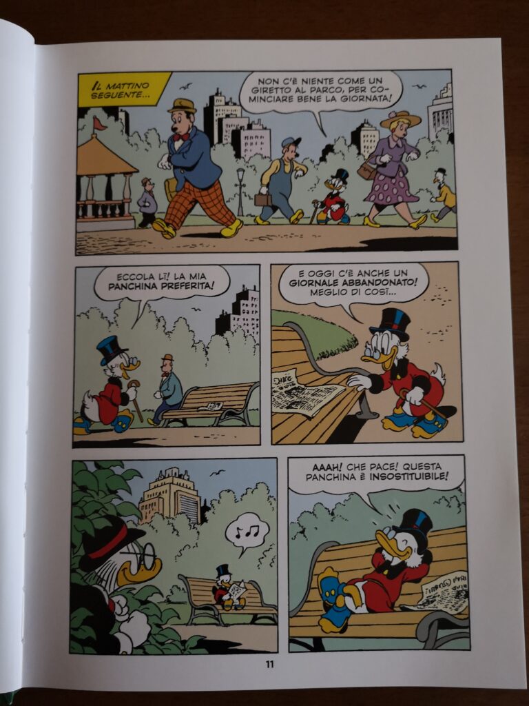 Partiamo subito con la fonte delle sue idee più vincenti: la panchina sulla quale è solito sedersi al parco di prima mattina. Una storia di invidia dove Paperone si scontra con l’acerrimo rivale Rockerduck.