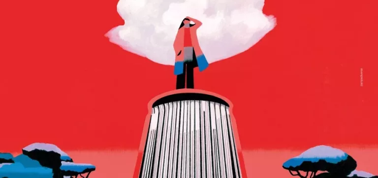 Il manifesto di questa edizione è firmato da Antonio Pronostico. L’illustratore, uno dei più interessanti nel panorama italiano, con le sue campiture di colore accese e brillanti crea scene surreali che sono metafore visive. Una donna scruta l’orizzonte da un’alta colonna posta tra gli alberi; i libri dunque come vette da cui osservare il mondo per interpretarlo da un’altra prospettiva, per orientarci nella sua estensione e complessità.