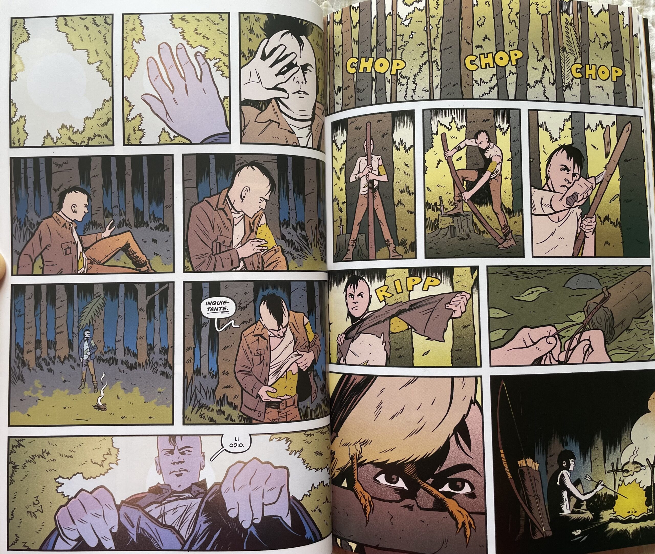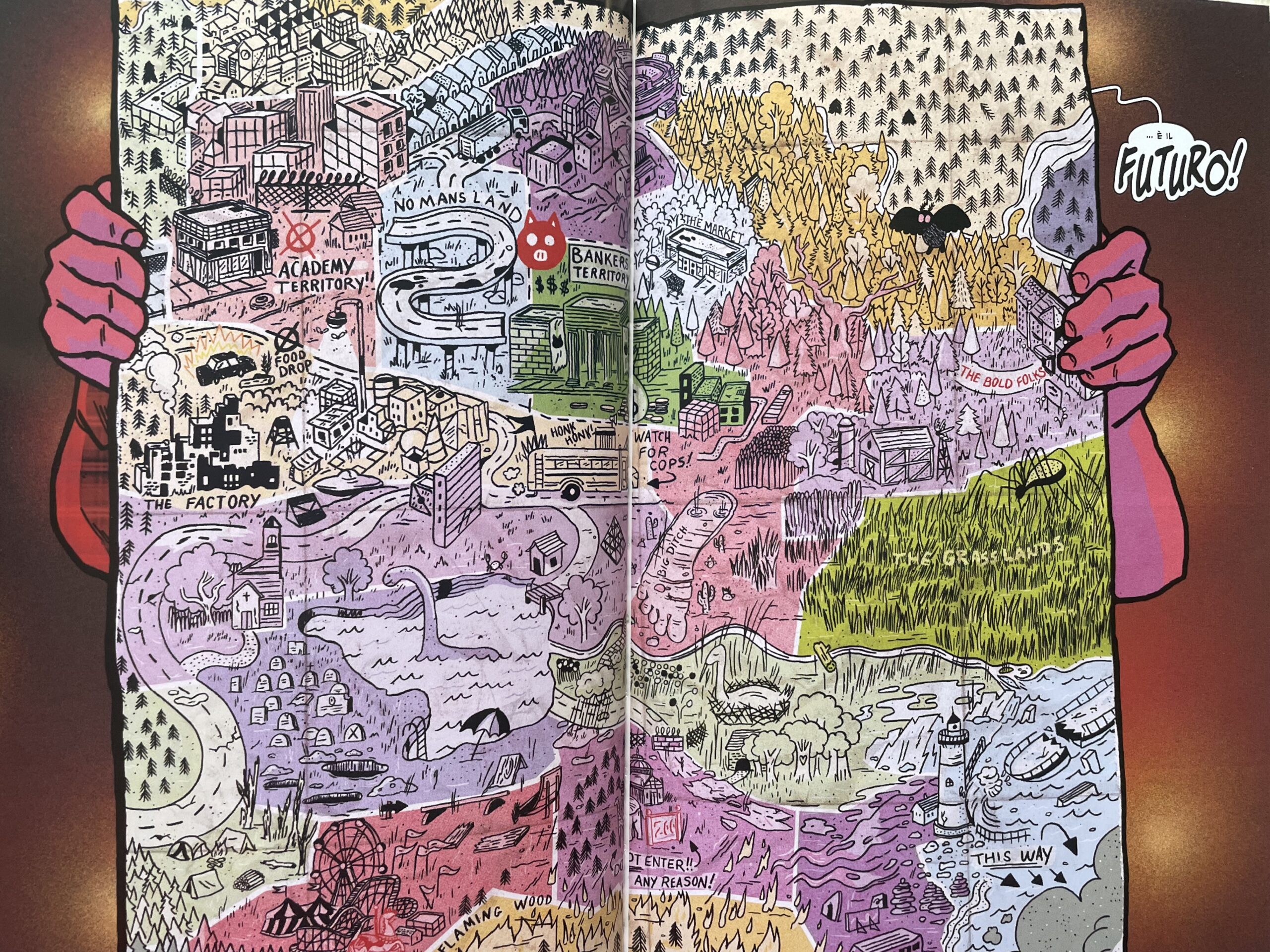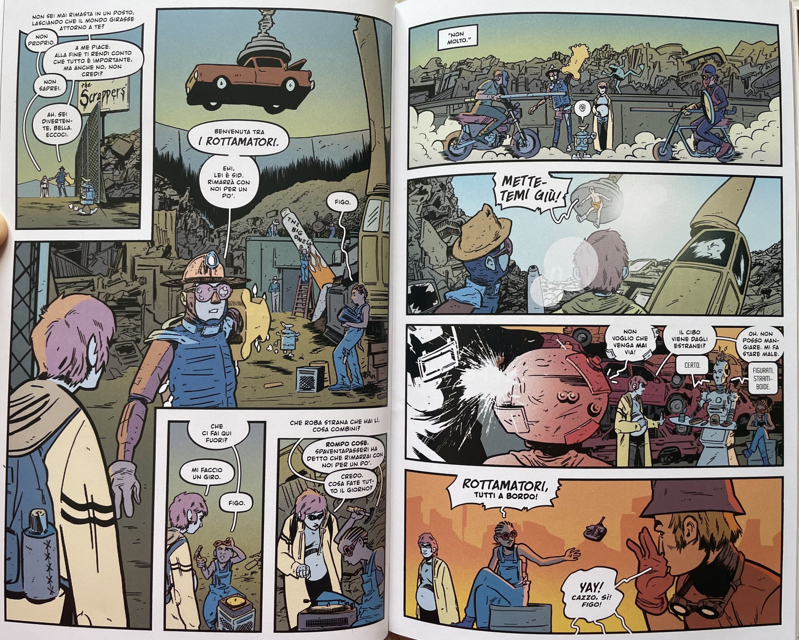 La mappa mostrata da Sid all’inizio del volume ci fa rendere conto di come il team creativo abbia svolto un grande lavoro nel dare vita a uno scenario ricchissimo di dettagli e che è ancora tutto da scoprire. L’ambientazione generale è quella di una classica storia post-apocalittica o simile, dove la società è regredita a causa di alcuni eventi traumatici, ma è il modo di raccontarla e in cui prende vita tramite i disegni di Boss a renderla qualcosa di inedito e intrigante.