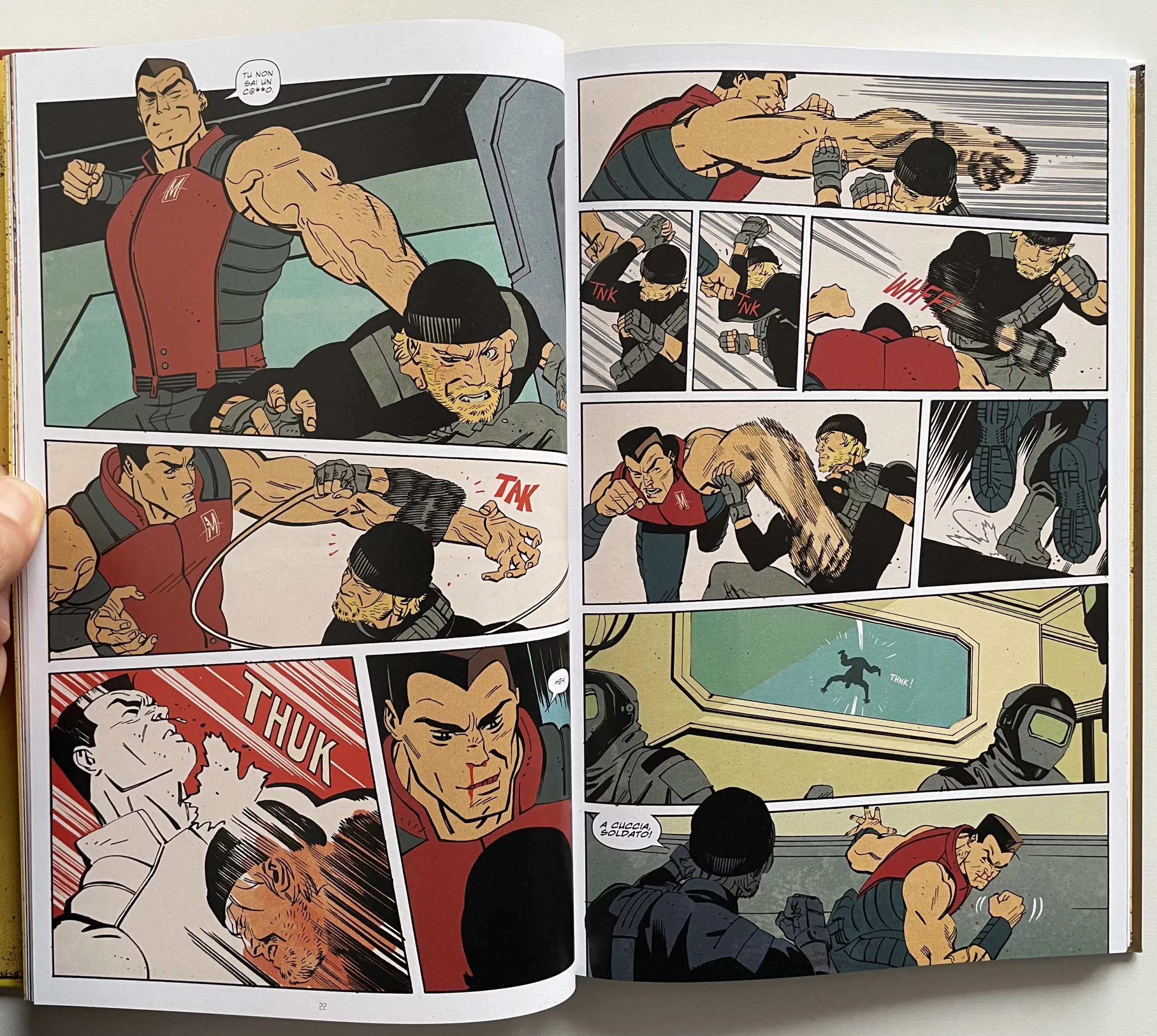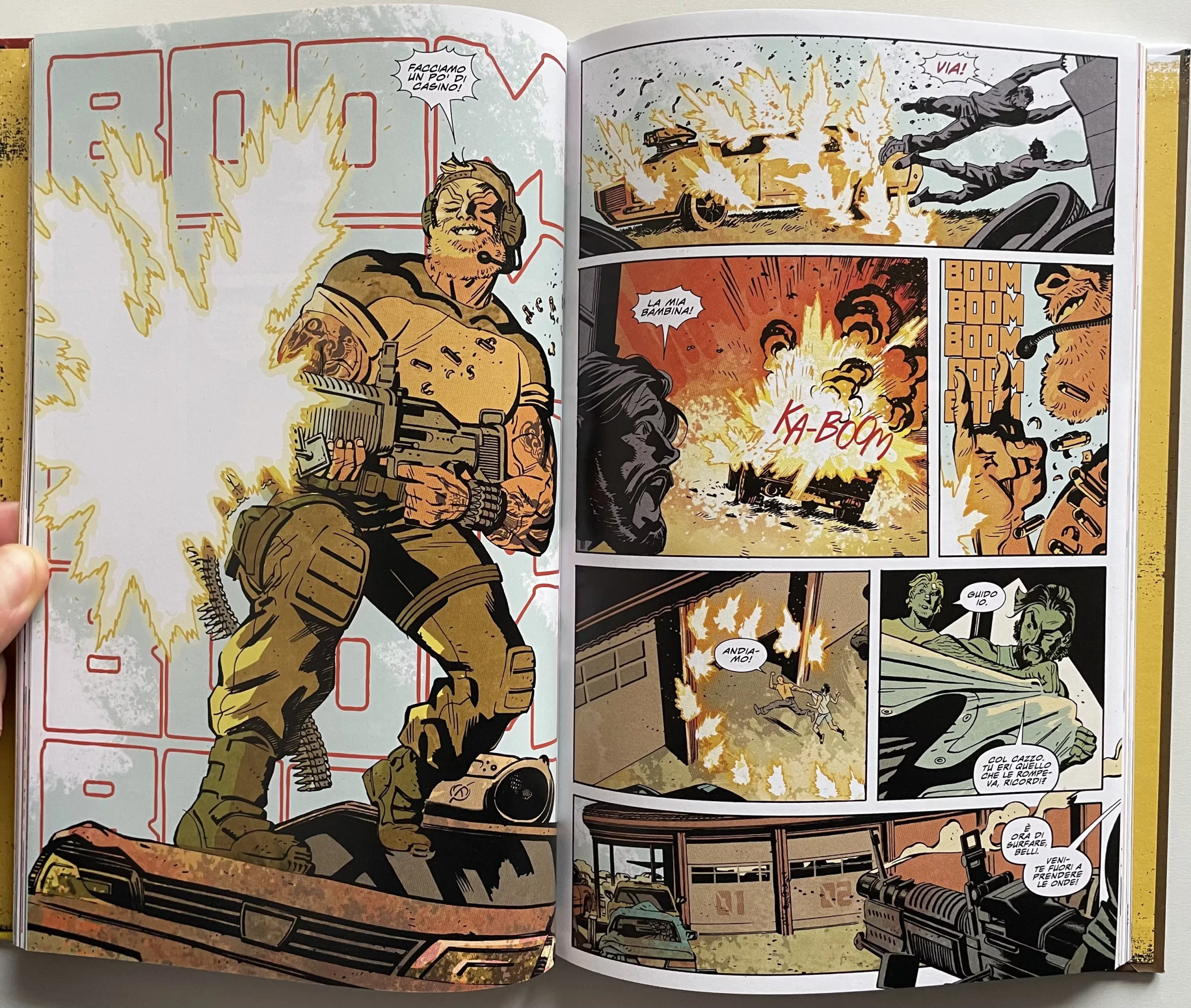 Duke è un eroe americano, ha sempre lottato per il suo paese ma ora sta mettendo in dubbio ogni cosa. Ferito nel corpo e nell’anima, vorrebbe credere nel sistema ma ne viene respinto. Un personaggio che ricorda sicuramente la figura di Capitan America e una trama che riprende in parte elementi visti in tanti film di spionaggio o nello stesso Captain America: Civil War. Al di là di questo, la storia scorre a ritmo sostenuto e i disegni di Tom Reilly sono la ciliegina sulla torta. Con uno stile pulito ma molto dinamico, arricchito dai colori sempre ottimi di Jordie Bellaire, il disegnatore dà spesso vita a soluzioni interessanti, come nella tavola che vedete qui sotto, con la ripetizione dell’onomatopea “boom” sullo sfondo a rendere anche visivamente la violenza dei colpi del personaggio. Inoltre, c’è ovviamente un grande rispetto per l’iconografia del franchise, svecchiata e resa più moderna in alcuni aspetti ma sempre fedele alle origini.