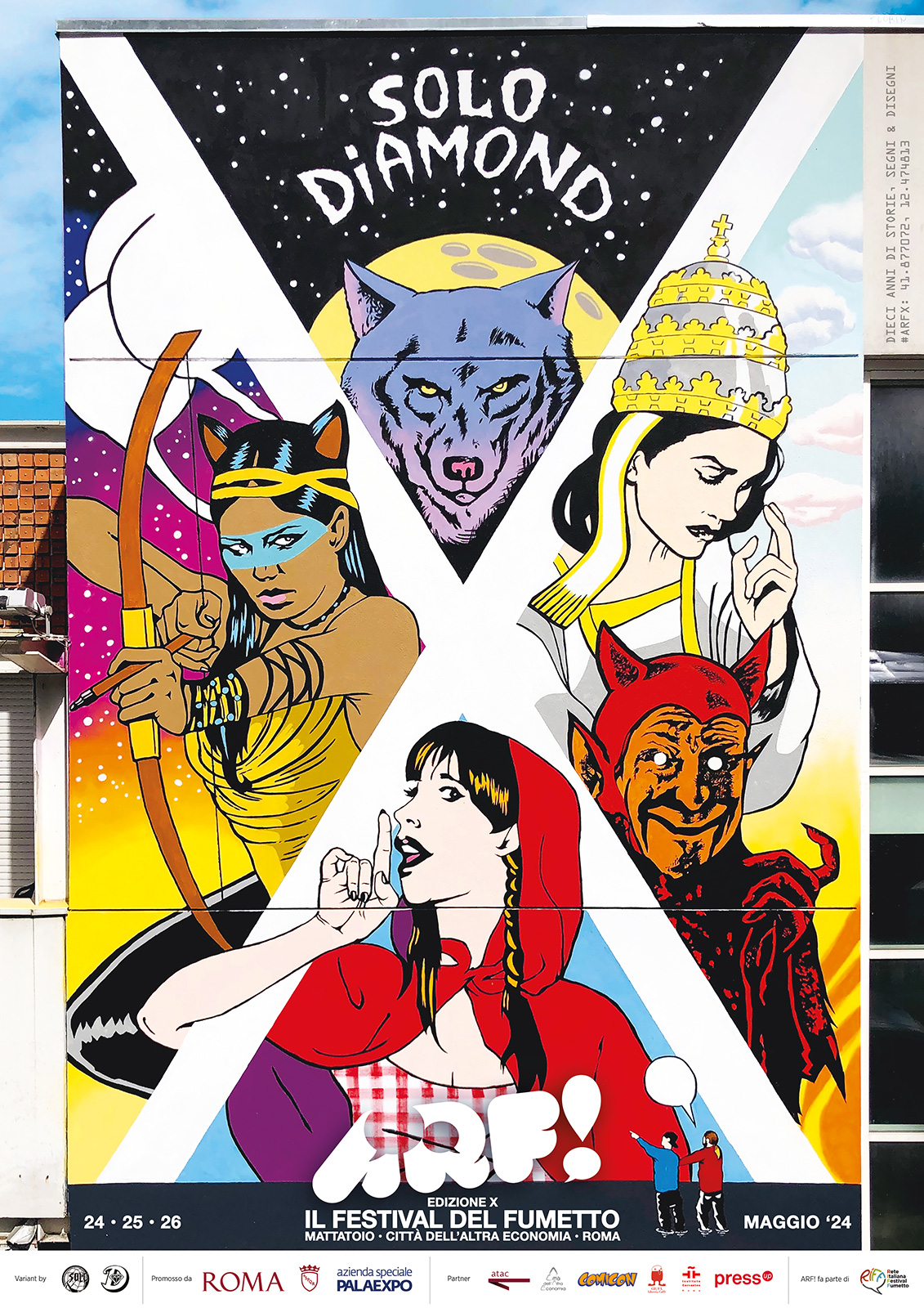 E ancora: in Area Kids il percorso espositivo dedicato ai fumetti e alla serie animata di Avatar (la celebre serie USA creata da Michael Dante DiMartino e Bryan Konietzko, anch’essa di recente trasposizione in live action per Netflix; la potenza lisergica di Hurricane e del suo Euforico Hangover all’interno degli spazi della Self Area, negli atelier della Galleria delle Vasche; il talento della fumettista e illustratrice Iris Biasio (Premio Bartoli di ARF! 2023 “Miglior promessa del Fumetto italiano”). In mostra anche i due street artist SOLO & Diamond con un’esposizione/racconto della loro intensa attività di respiro europeo, spesso iconograficamente ispirata al Fumetto, oltre che autori della versione variant del manifesto di ARF! 2024, dipinta a fine aprile su una delle pareti del Mercato Testaccio. L’opera murale, che con la sua grande X centrale celebra i 10 anni di ARF!, è la prima in assoluto prodotta dal Municipio Roma I Centro, in uno dei rioni storici della città, Patrimonio dell’Umanità UNESCO.
