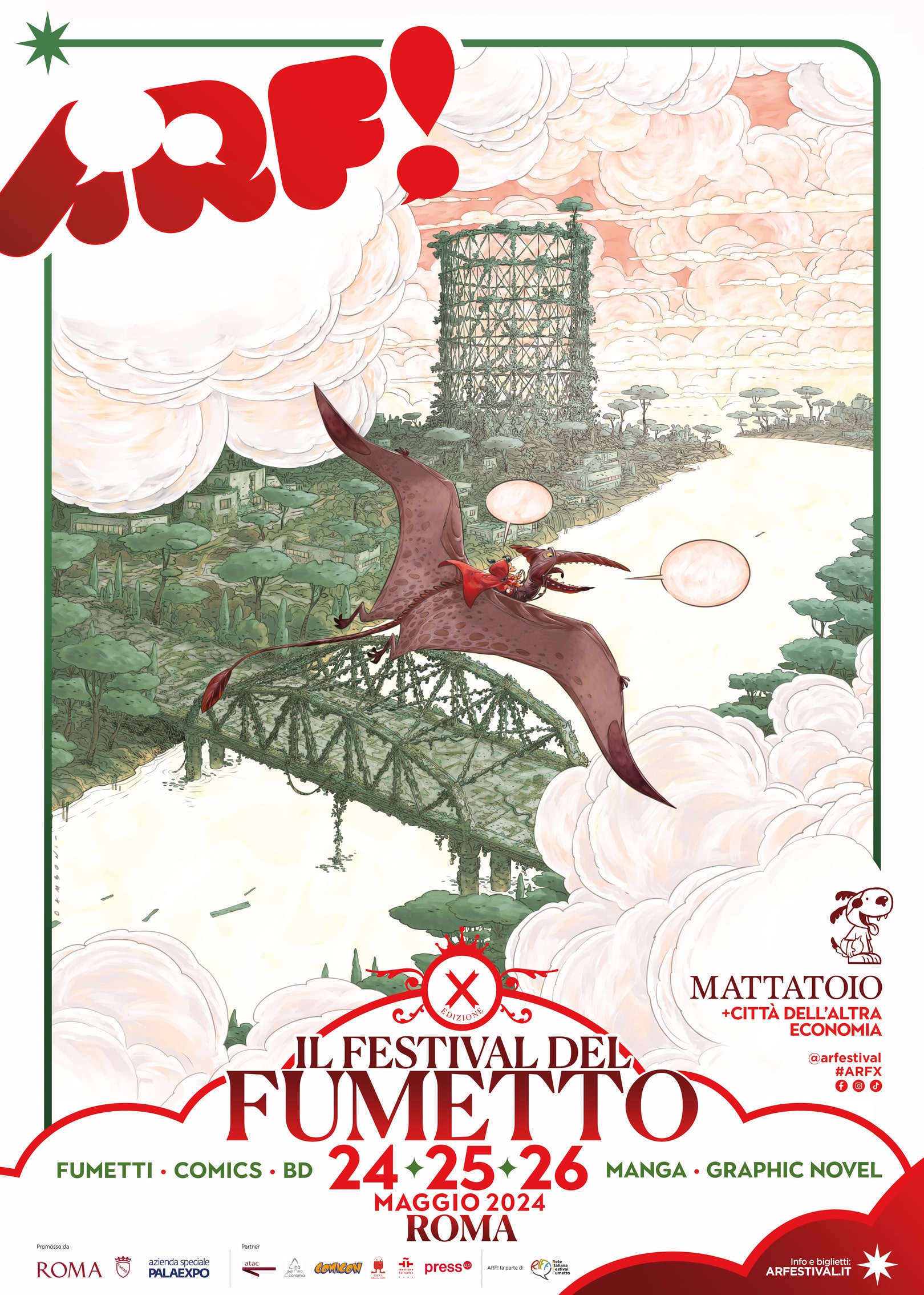 Celebrando il traguardo della sua decima edizione, dal 24 al 26 maggio 2024, alla Pelanda del Mattatoio e alla Città dell’Altra Economia di Roma, torna ARF! Festival, la festa di chi ama, scrive, disegna, legge e respira fumetti.