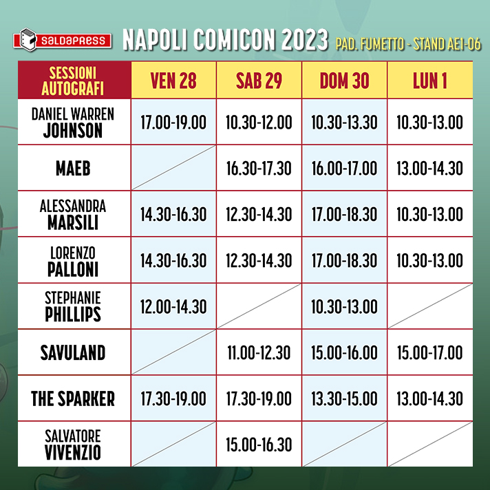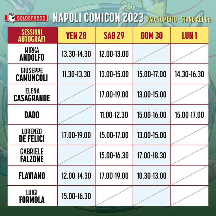 Per quanto riguarda invece le sessioni di firmacopie allo stand ecco quando potrete incontrare gli autori saldaPress: