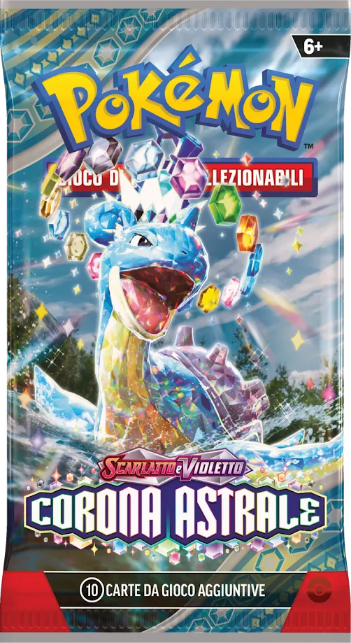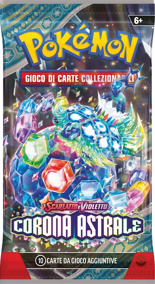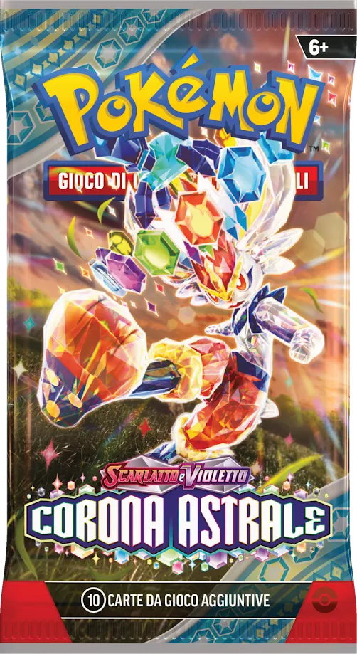 L’espansione Scarlatto e Violetto – Corona Astrale consente ai giocatori di immergersi nella meraviglia del fenomeno Teracristal, apparso per la prima volta nei videogiochi Pokémon Scarlatto e Pokémon Violetto, con l’introduzione dei Pokémon-ex Teracristal Astrali nel GCC Pokémon. Ciascun Pokémon-ex Teracristal Astrale ha un attacco speciale il cui nome trae ispirazione da diverse gemme e che richiederà tre tipi differenti di Energia. L’espansione porta inoltre con sé illustrazioni peculiari che mettono in risalto le splendide qualità cristalline dei Pokémon-ex Teracristal Astrali.