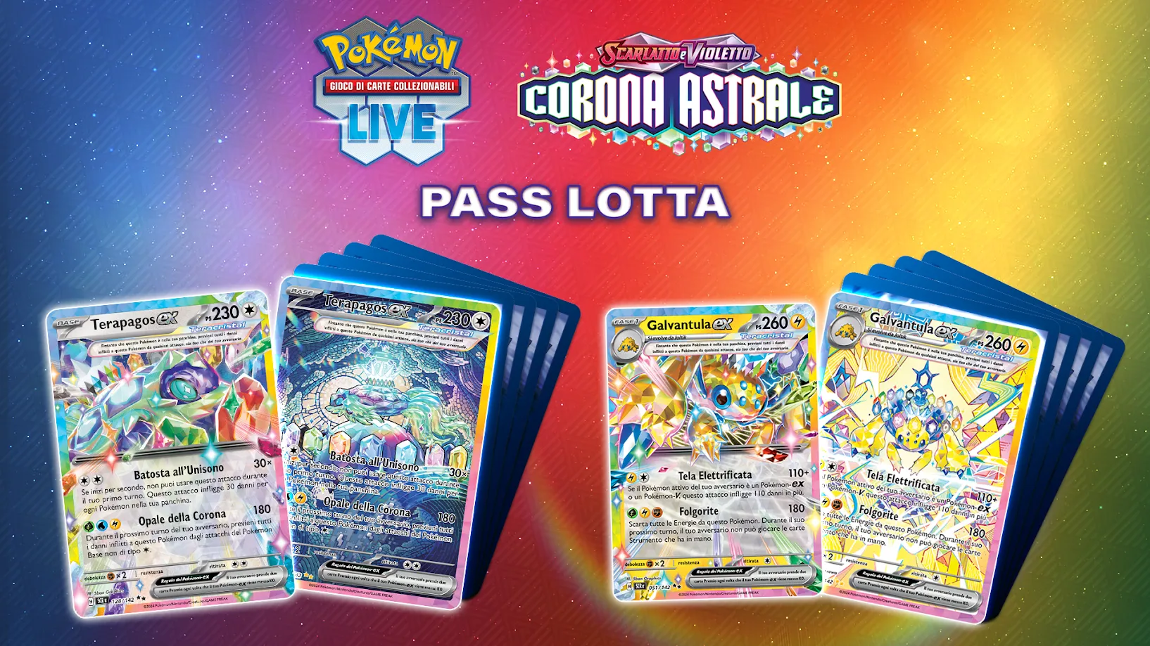 Si può inoltre giocare con Scarlatto e Violetto – Corona Astrale in versione digitale sull’app GCC Pokémon Live per dispositivi iOS, Android, macOS e Windows. Gli Allenatori possono ottenere e lottare con i Pokémon-ex Teracristal Astrali e, quando effettuano l’accesso, il Pass lotta, sbloccabile fino alle ore 16:00 del 7 novembre, dell’espansione Scarlatto e Violetto – Corona Astrale li premierà con un nuovo mazzo con protagonista Terapagos-ex. È anche possibile sbloccare un mazzo premium aggiuntivo di Galvantula-ex riscattando i cristalli guadagnati al completamento degli obiettivi giornalieri.