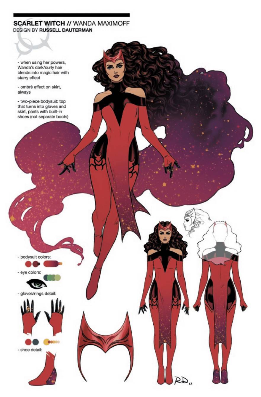 Una delle pagine finali del numero presenta il design di Scarlet Witch di Dauterman e i relativi concept art, che lo stesso Dauterman ha condiviso sui social media nel novembre del 2022. Le note di progettazione accompagnano i concept, spiegando che “quando usa i suoi poteri, i capelli scuri e ricci di Wanda si trasformano in capelli magici con [un] effetto stellato”. I lettori possono vedere questo effetto in Scarlet Witch #1 quando Wanda vola intorno a un enorme mostro marino, Caecelon, e successivamente affronta Jackson Day, alias il Corruttore.