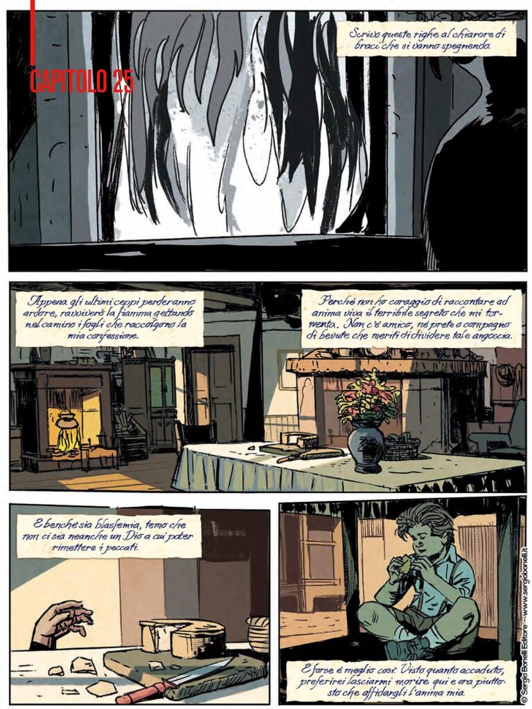 Aggiunge Giovanni Masi: “Spesso raccontare non è solo una questione di gusto, ma anche la necessità di andare incontro alla propria storia e ai propri personaggi. E questo ci porta alle ultime pagine di questo albo, in cui il ragazzo con la testa in fiamme, che abbiamo intravisto per 8 numeri, entra in scena prepotentemente, di giorno, in una tranquilla piazzetta di un placido paesino di montagna. E la vita dei nostri personaggi non sarà mai più la stessa”.