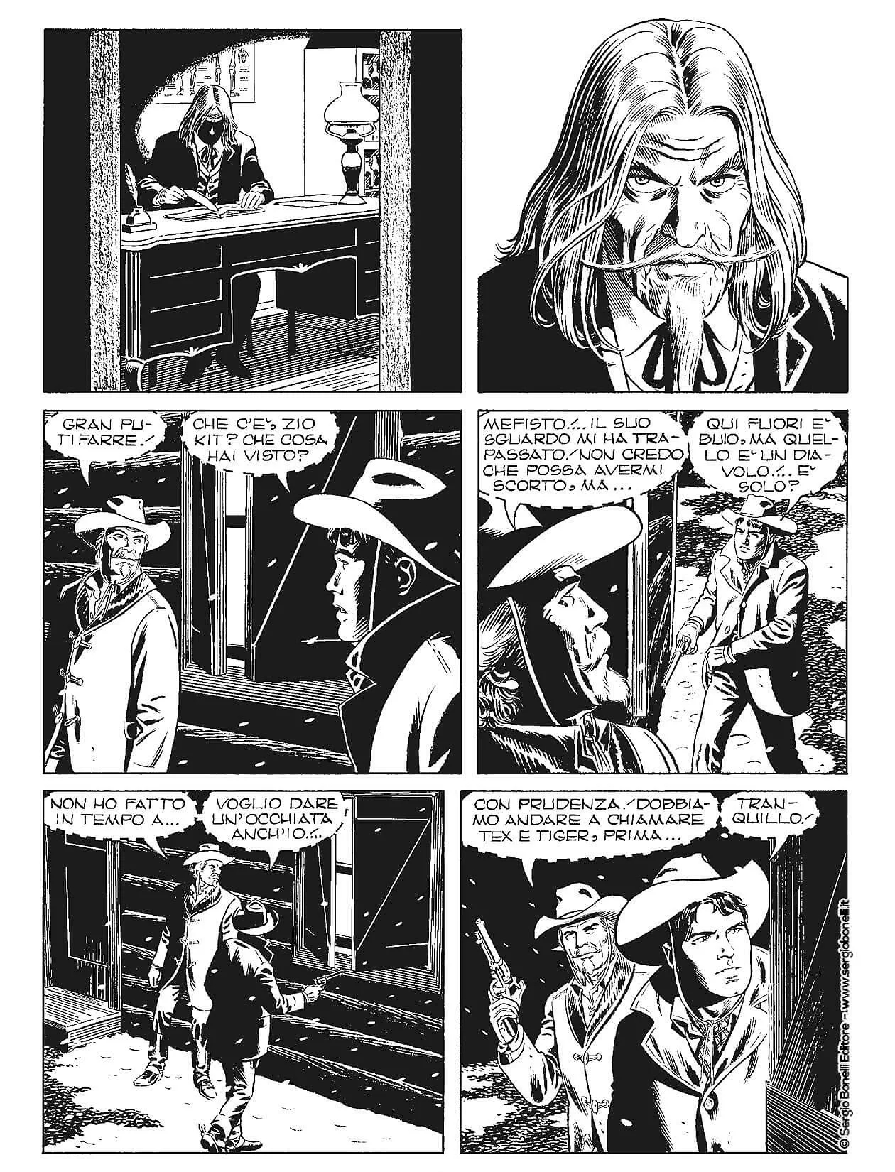L’illusionista, spia, mago, ipnotista e signore del male, dall’aspetto mefistofelico e dallo sguardo sinistro, Steve Dickart, alias Mefisto, nel corso di molte avventure elabora piani diabolici per eliminare Tex e i suoi pards, usando le abilità più oscure, contro le quali le pistole possono poco o nulla. Sulle pendici ghiacciate della Sierra si scatena la caccia di Tex e compagni a Mefisto e al figlio Yama, di nuovo in possesso di micidiali poteri. A loro si unirà anche Lily, per una imprevedibile e letale riunione di famiglia! Ma al fianco dei pards si schiera Padma, e tutti si recano dal saggio El Morisco, per evocare un altro indispensabile e magico alleato… Mefisto evocherà ogni possibile orrore e attenderà lo scontro finale contro i suoi più acerrimi nemici.