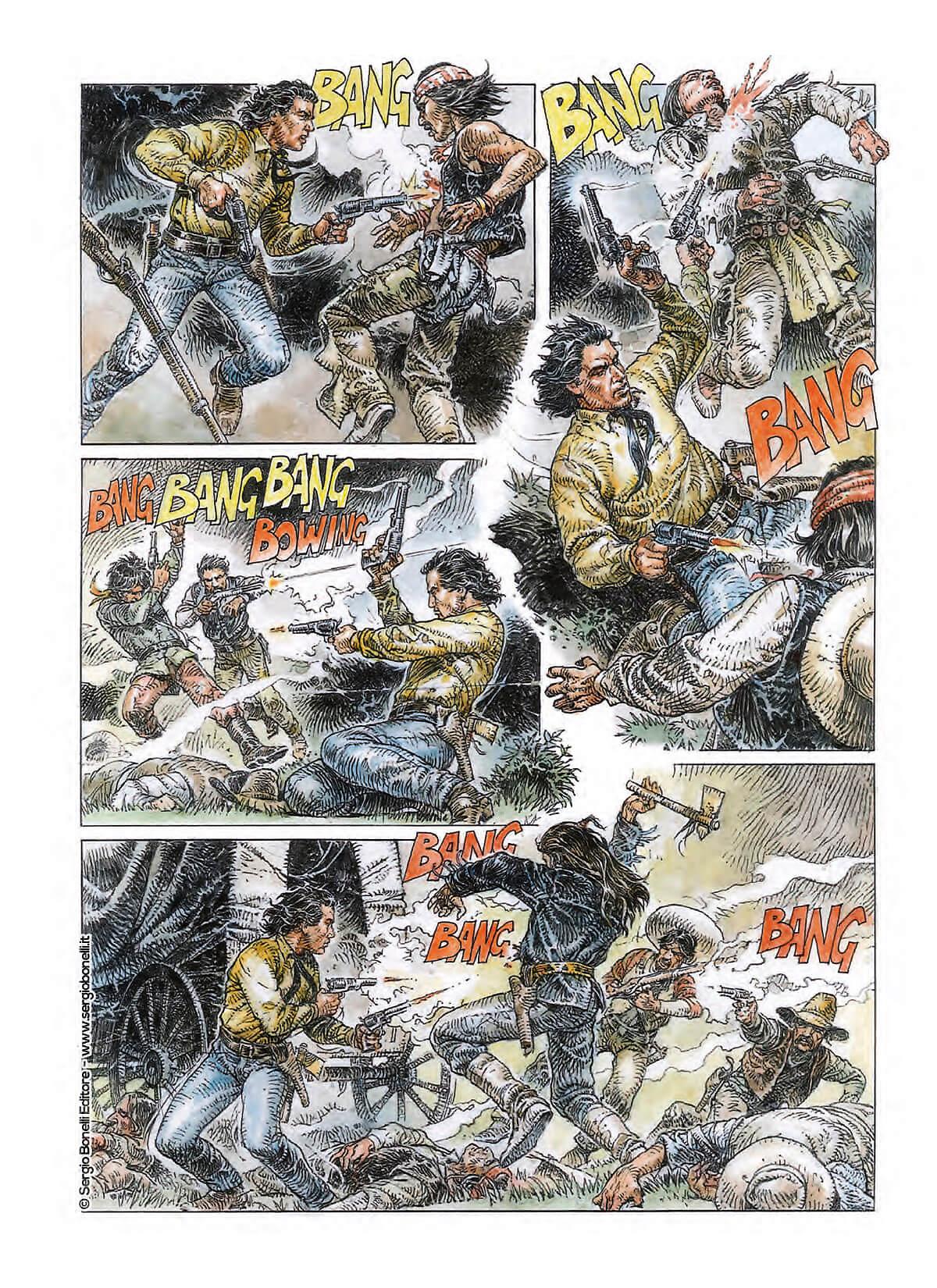 Per l’occasione, il maestro Paolo Eleuteri Serpieri scelse di raccontare Tex con uno sguardo inedito, scrivendo e disegnando una storia dai toni epici che univa il mito della Frontiera e quello del celebre personaggio creato da Gianluigi Bonelli. In queste pagine incontriamo un giovane Tex Willer, prima della nascita della fortunata collana a lui dedicata, e uno scalpitante Carson alle prese con centinaia di Comanches selvaggi, in un’atmosfera da leggenda western.