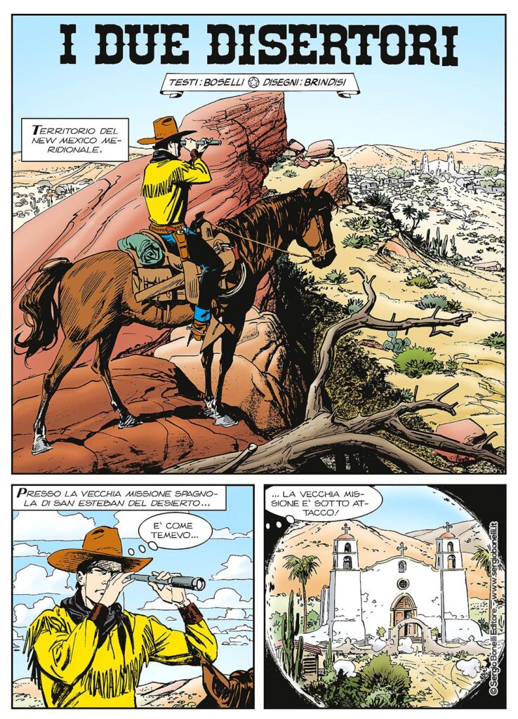 In TEX – I DUE DISERTORI, scritto da Mauro Boselli, disegnato da Bruno Brindisi, con la copertina di Massimo Carnevale e i colori a cura di GFB Comics, Tex galoppa sotto le stelle del Messico in compagnia di due disertori per liberare Tesah, la bella principessa Pawnee rapita dai ranch di Saint Thomas.