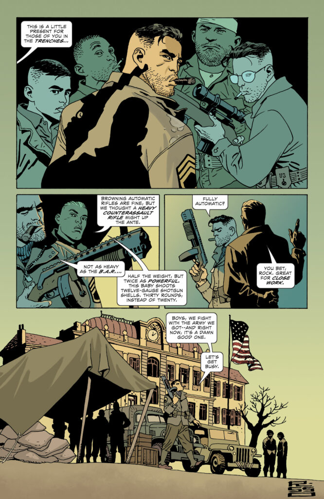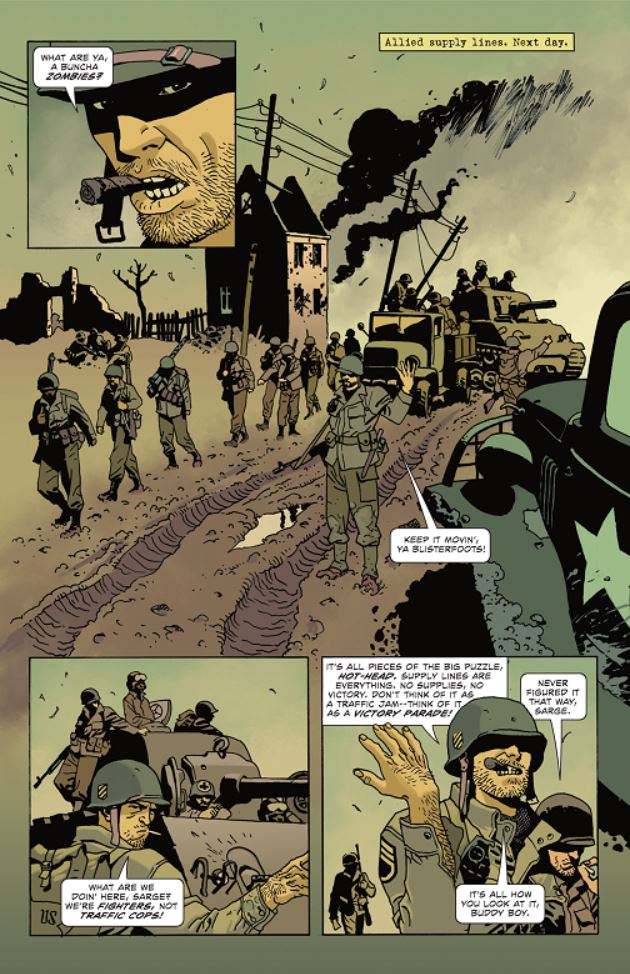 Campbell reinterpreta in chiave moderna il Sgt. Rock donandogli nuova linfa, rendendolo un personaggio davvero tagliente e poco politicamente corretto. Sicuro, sprezzante, arrogante e determinato, il Sergente ha un chiodo fisso, porre fine ad ogni costo alla guerra, fosse anche compiendo l’estremo sacrificio. Fantastici i rapporti tra lui e la sua compagnia, con cui si crea un cameratismo e una complicità davvero ben gestite. Ma a rubare la scena è sempre il protagonista indiscusso, che raggiunge il massimo dell’arroganza nello scontro finale con Hitler. La storia corre veloce in un crescendo di adrenalina e sangue che sembra uscire da ogni pagina. Ci si prende sicuramente gioco dei film di guerra con i nazisti, ma soprattuto di questi ultimi, che trasformati in zombi vengono totalmente disumanizzati, lasciando spazio alla satira e al black humor.