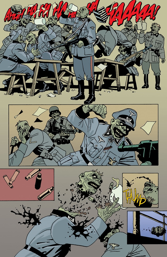 La sceneggiatura di Bruce Campbell ci proietta dritti in un B movie horror pulp narrato per mezzo del medium fumettistico. La trama è molto semplice e si può riassumere in poche righe. I nazisti nel ’44 sono in difficoltà e ormai prossimi alla sconfitta. Ma Hitler ha ancora un ultimo asso nella manica, un siero in grado di riportare in vita i morti. Il Sgt. Rock e la sua Easy Company, dovranno dunque sventare questa ultima minaccia in grado forse di ribaltare le sorti della guerra. Ma è importante capire come la forza dell’opera stessa risieda proprio nelle sua trama lineare. La storia scorre veloce attraverso una narrazione avvincente, ricca d’azione e di scene splatter. Pagina dopo pagina si alza il tiro, rendendo la storia via via più assurda e per questo dannatamente divertente. I testi sono ridotti al minimo e garantiscono una scorrevolezza invidiabile. Potremmo dunque definirlo un fumetto coerente con l’esperienza cinematografica dell’autore.