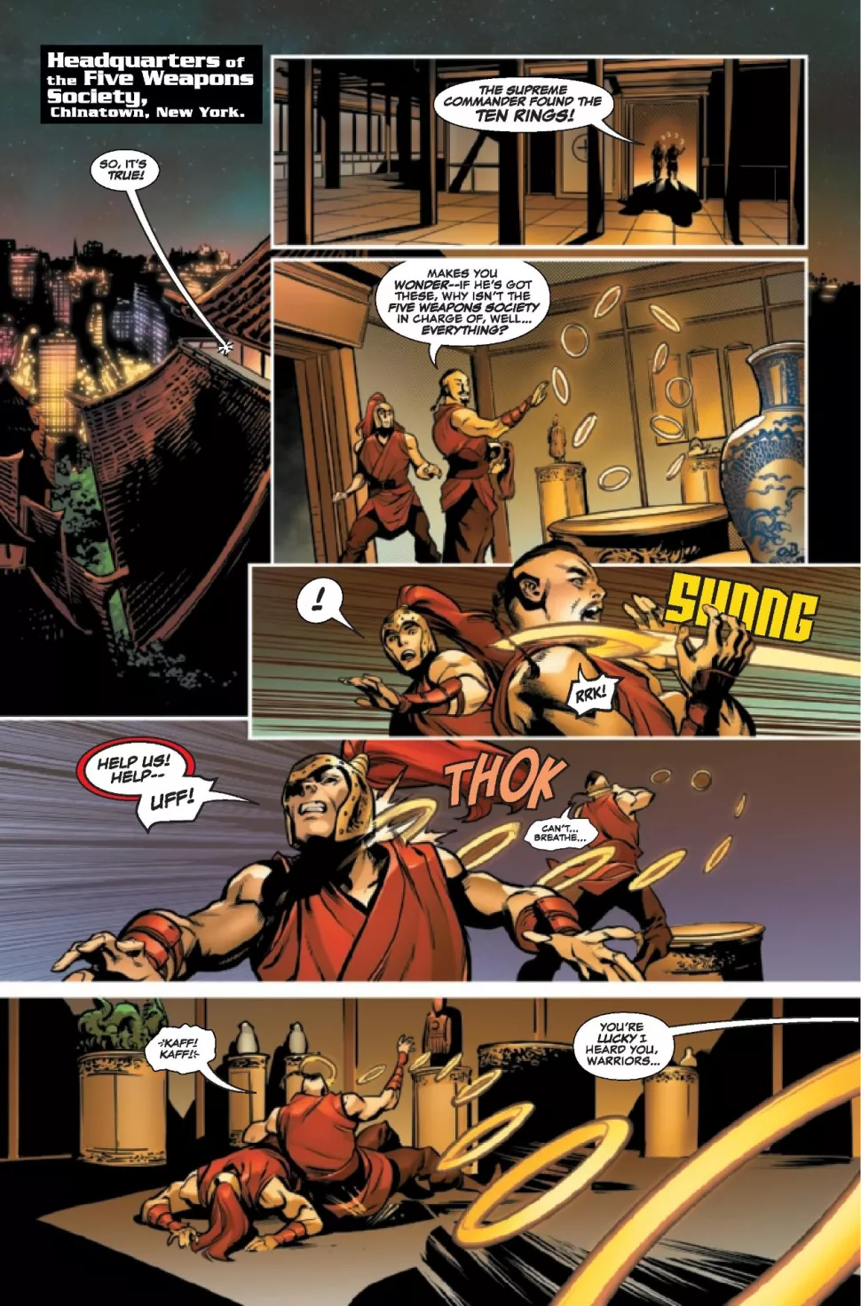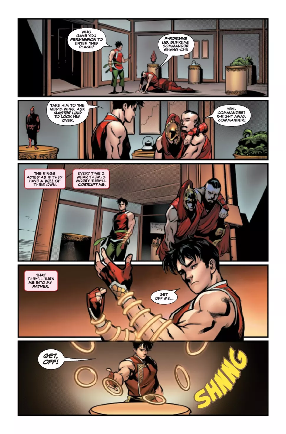 È qui che troviamo l’eroe all’inizio della sua nuova serie, in Shang-Chi e i Dieci Anelli #1. Scritto da Gene Luen Yang, illustrato da Marcus To, colorato da Erick Arciniega e letterato da Travis Lanham, il numero d’esordio inizia con i membri della Società delle Cinque Armi che si avvicinano ai Dieci Anelli e si chiedono perché non stiano governando il mondo se Shang-Chi ne è in possesso.