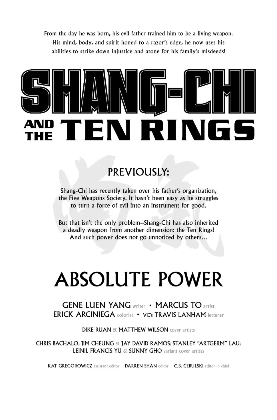 Il testo dell’annuncio per Shang-Chi and the Ten Rings #1 avverte che “ogni cacciatore di taglie, assassino e sindacato del male nell’Universo Marvel” vuole impossessarsi dei Dieci Anelli, il che lo costringerà a padroneggiarli o a cedere alle forze del male che sta cercando di sconfiggere con tanta fatica.