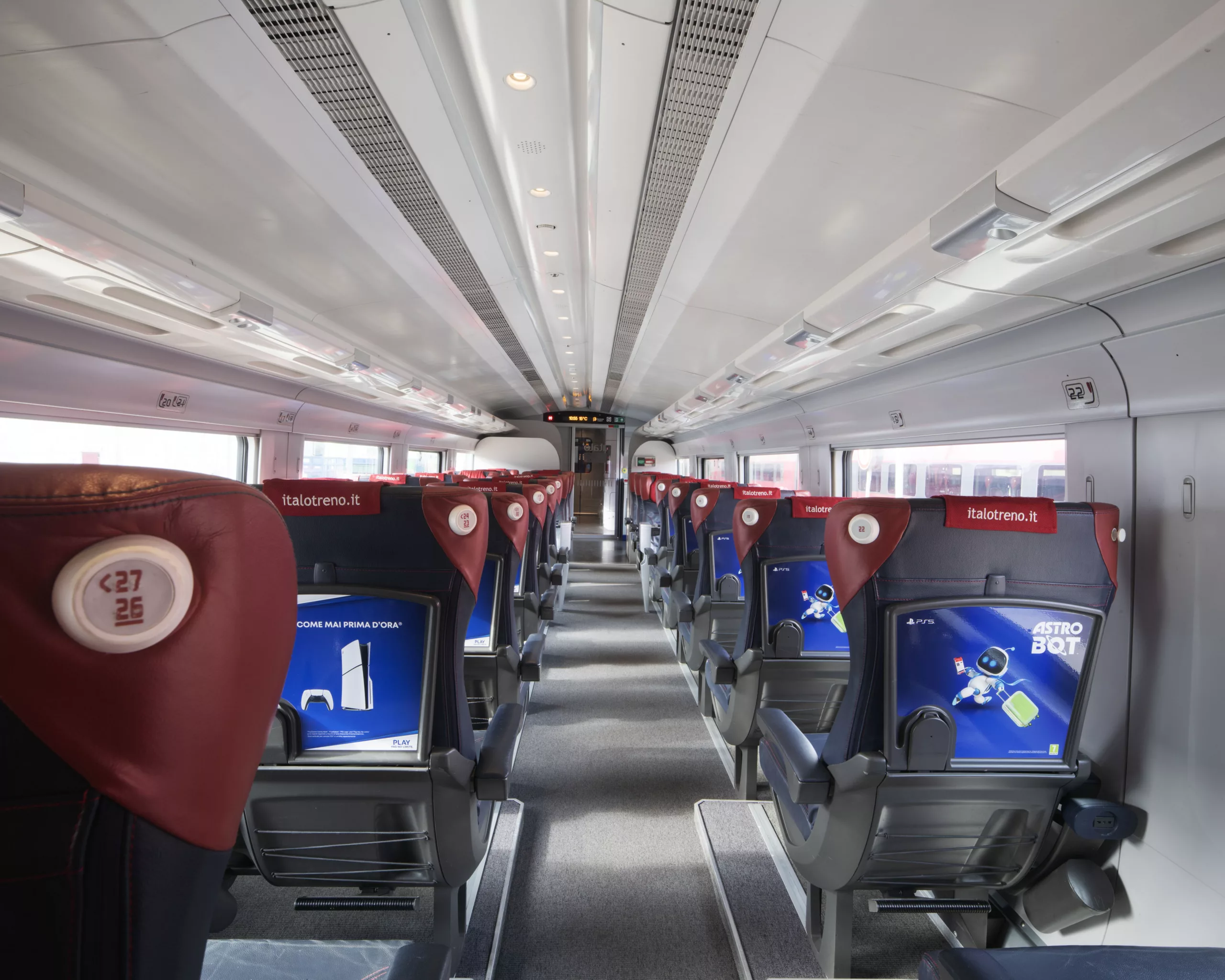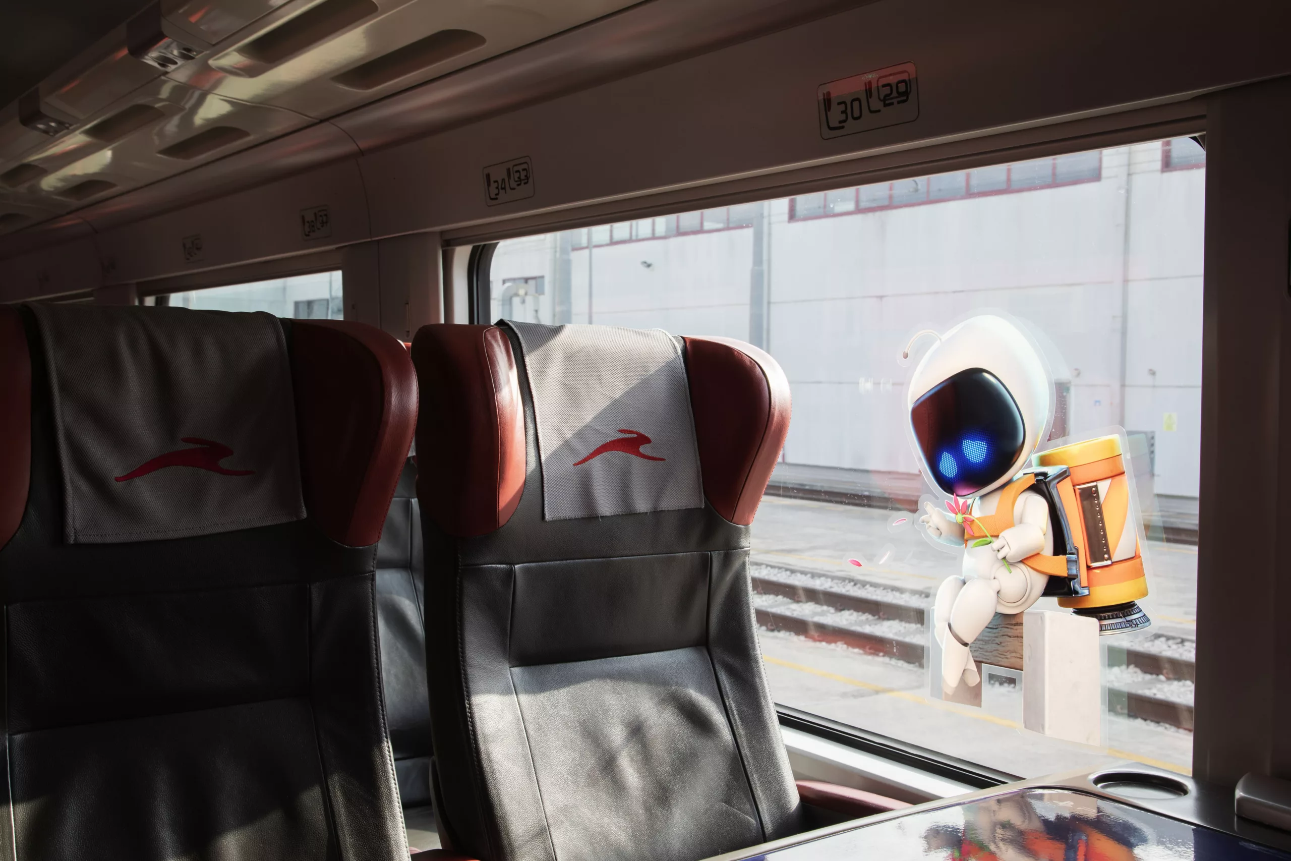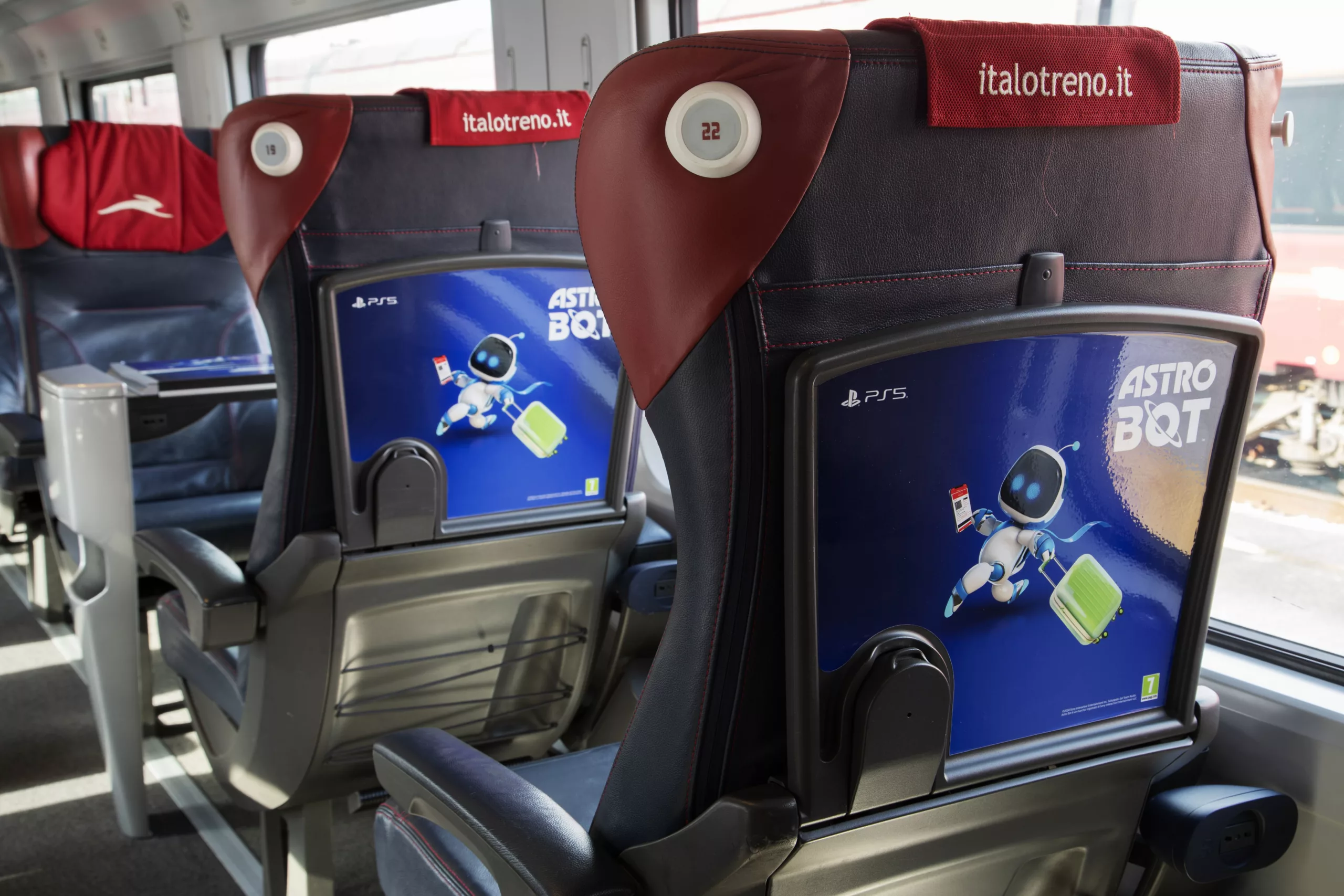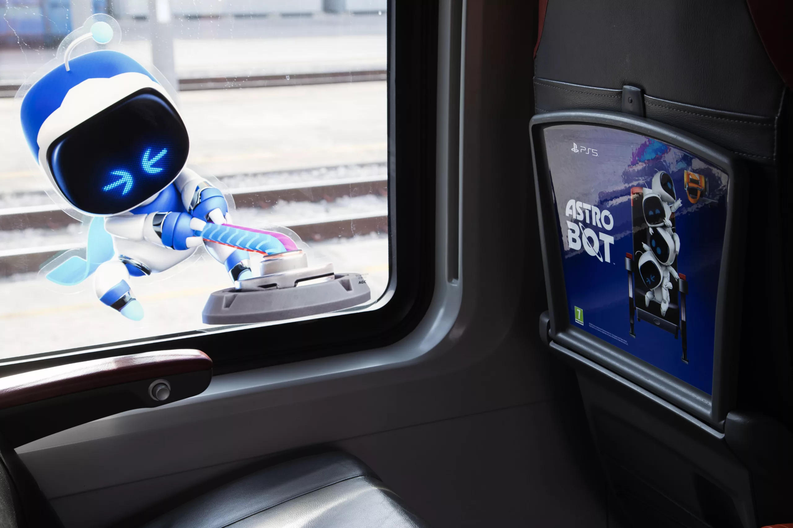 All’interno delle carrozze, i tavolini e i finestrini sono arricchiti da decorazioni che richiamano PS5 e l’universo di Astro Bot, comprese le versioni speciali dei Bot e i power-up presenti nel gioco.