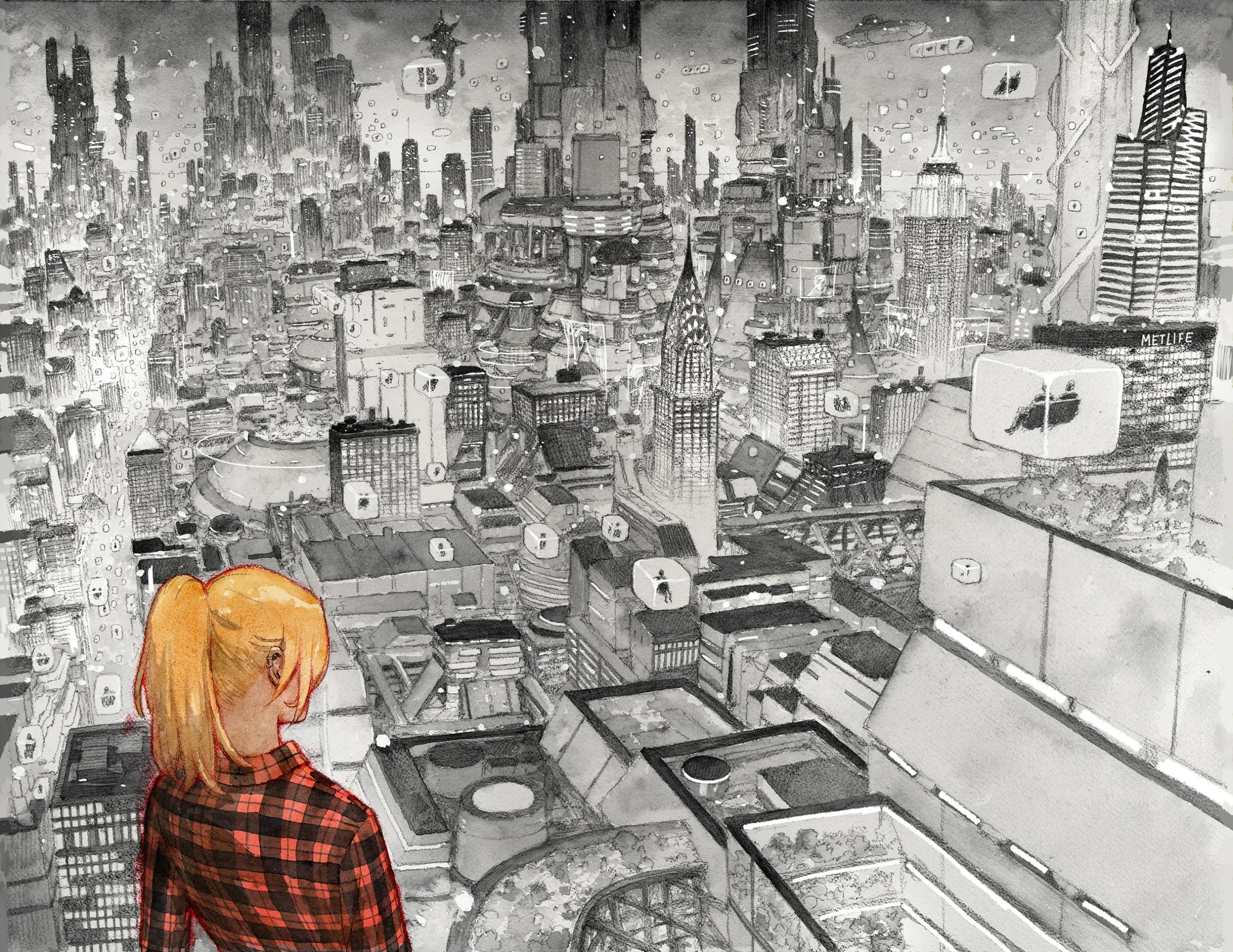 Vaughan crea con Spectators una sorta di effetto matrioska: la storia di Val è contenuta all’interno della storia di questo mondo abitato da spiriti, e la storia di Val e Sam come spiriti che osservano è contenuta all’interno della matrioska finale, il fumetto stesso, di cui il lettore risulta spettatore finale e, in un certo senso, persino protagonista. Nonostante il contesto sia, superate le prime pagine, traslato in un futuro potenzialmente ancora lontano, è chiaro come l’intento sia di fornire una prospettiva su quella che è la società attuale, le sue storture e i suoi controsensi. Tra ipersessualizzazione, guerre e stragi, Vaughan mette davanti al lettore elementi che sono già quotidiani ma lievemente più sommersi rispetto alla rappresentazione futuristica, evidenziando l’ipocrisia odierna in cui va bene compiere il peccato ma guai a rivelare il peccatore. Spectators rende questo passaggio più semplice e immediato e, seppur in alcune parti sommariamente, tocca anche temi di un certo spessore e più pungenti in alcuni contesti sociali rispetto ad altri (basti pensare alle sparatorie di massa, più volte richiamate durante la storia e totalmente estranee a noi europei, ma parte della quotidianità per gli americani). Il focus del viaggio e del racconto resta comunque l’aspetto edonistico, con gli altri temi che si alternano e creano degli snodi di passaggio (interessanti e funzionali alla conclusione) senza però mai assurgere davvero a momenti centrali della storia, esclusivo appannaggio delle fasi “voyeuristiche” dei protagonisti.