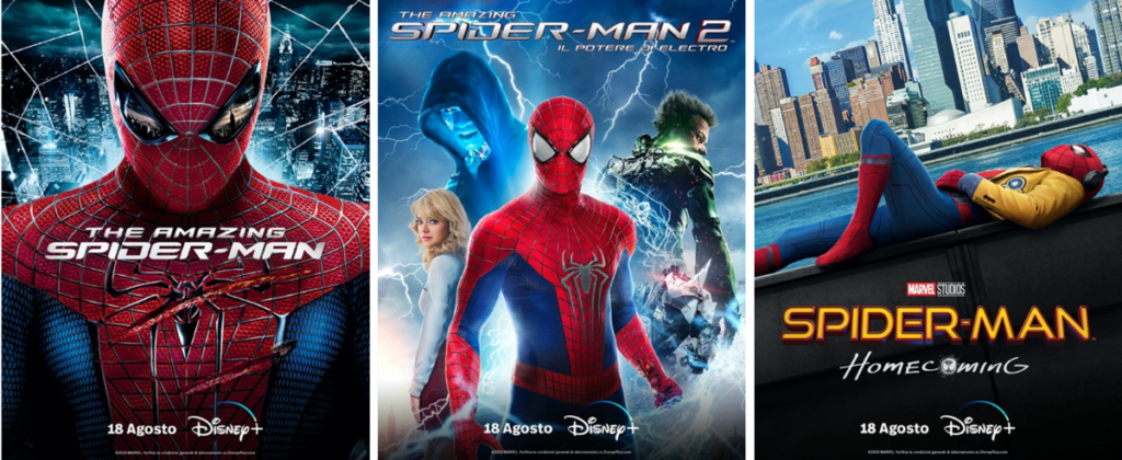 Disney+ ha annunciato che il 18 agosto arriveranno sulla piattaforma streaming sei film di Spider-Man™, dando accesso ai fan ad ancora più contenuti Marvel, tutti in un unico posto. Saranno disponibili i primi film di Spider-Man™: Spider-Man™ (2002), Spider-Man™ 2 (2004), Spider-Man 3 (2007), The Amazing Spider-Man™ (2012), The Amazing Spider-Man™ 2: Il Potere di Electro (2014) e Spider-Man: Homecoming (2017).