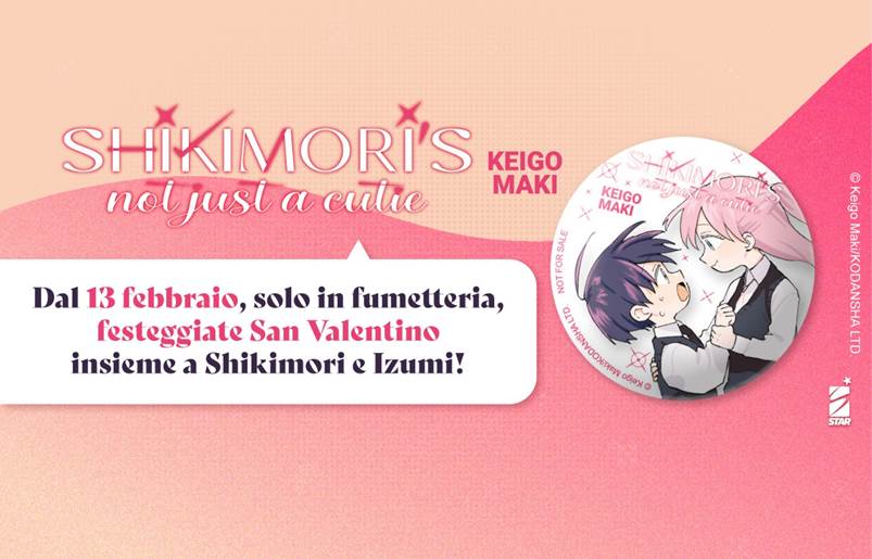 A partire dal 13 febbraio, in occasione dell’uscita del volume 4 della serie, ogni cliente che acquisterà in fumetteria almeno un volume di SHIKIMORI’S NOT JUST A CUTIE riceverà in omaggio una spilla esclusiva che raffigura i due protagonisti. La promozione sarà valida nelle fumetterie aderenti fino ad esaurimento scorte.