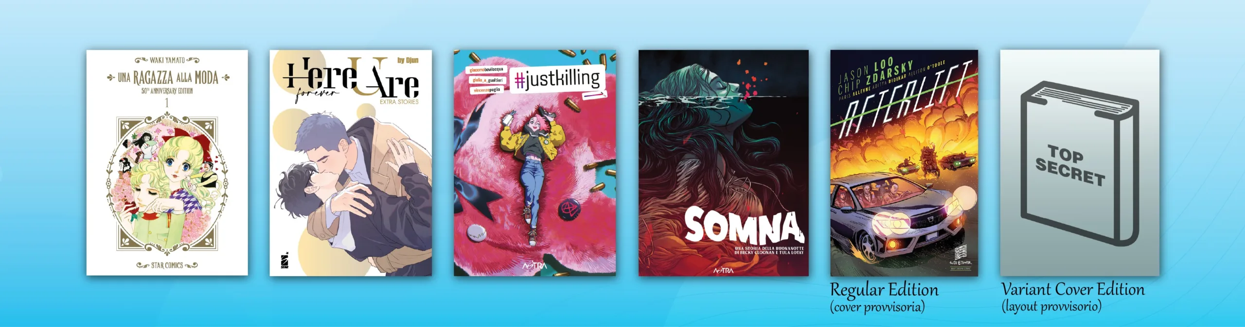 Il mese si chiuderà con le novità targate Astra del 29 aprile: #JUSTKILLING, un’appassionante survival story firmata Giacomo Bevilacqua e Giulio A. Gualtieri, con i disegni di Vincenzo Puglia; SOMNA, il volume unico cartonato a colori di Becky Cloonan e Tula Lotay che ha conquistato l’Eisner Award 2024 come “Best New Series” e infine AFTERLIFT, l’opera di Chip Zdarsky e Jason Loo, già premiata agli Eisner Awards, che porterà i lettori in un viaggio tra inseguimenti in auto e cacciatori di taglie demoniaci. Anche quest’ultimo titolo sarà disponibile in edizione Variant Cover.