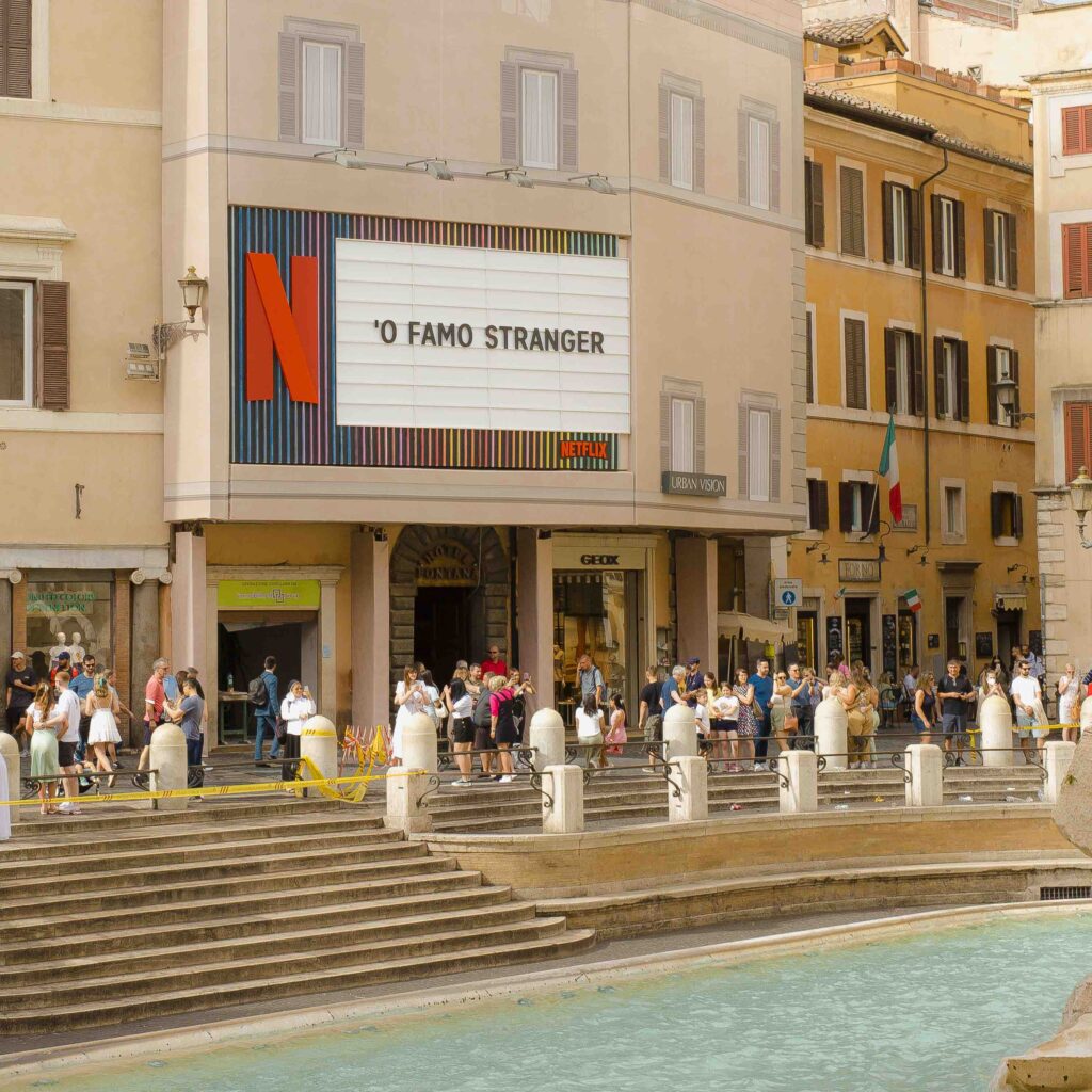Inaugurato in occasione dell’apertura ufficiale dell’ufficio italiano di Netflix a Roma lo scorso 6 maggio, il Marquee di Netflix, la speciale affissione permanente posizionata nella suggestiva cornice di Piazza di Fontana di Trevi, dedica questa settimana un messaggio speciale, quanto ironico, alla celebre serie Stranger Things in occasione del debutto della quarta stagione.