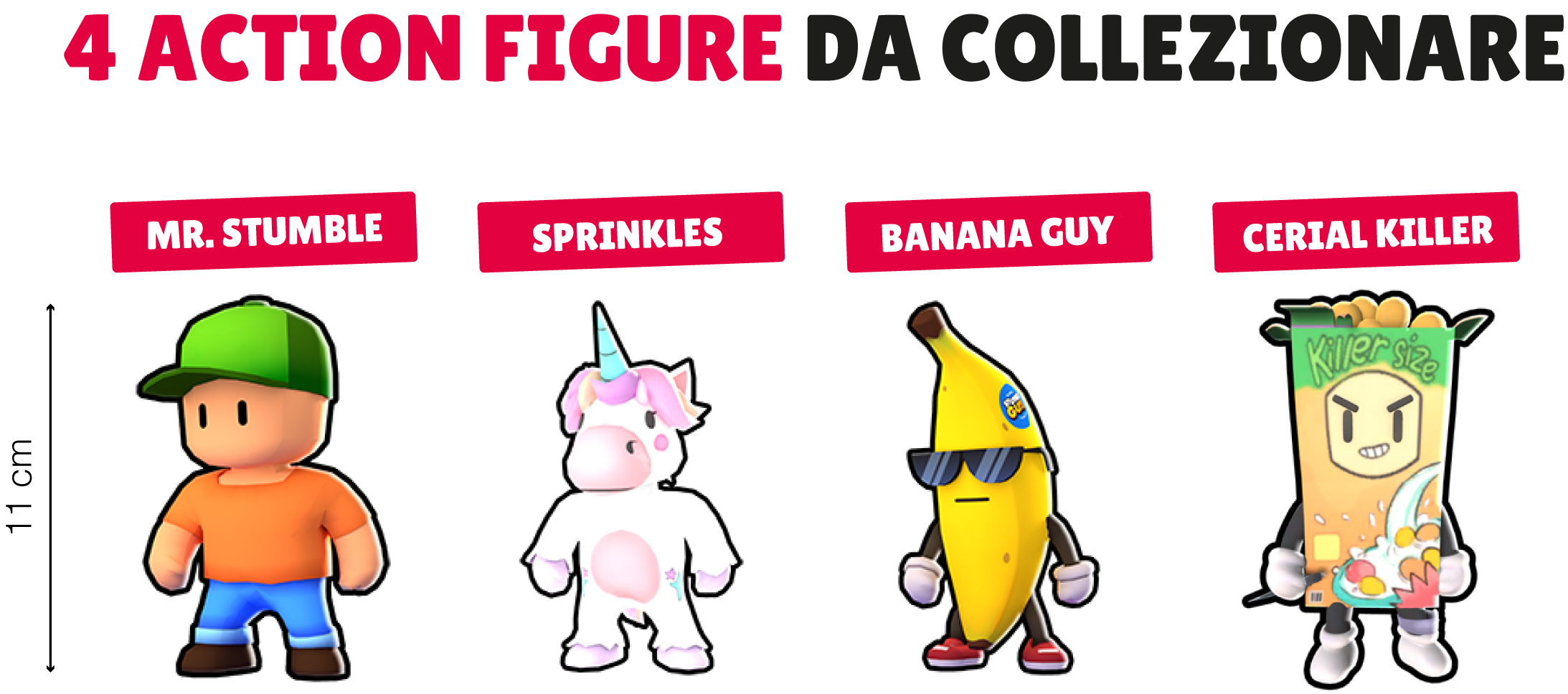 La collezione è un tributo all’incredibile successo di Stumble Guys, che l’anno scorso è stato insignito del titolo di Best Ongoing Game 2023 ai Google Play Best Awards. I fan avranno a disposizione 24 mini-figure alte 6 cm, tra cui 6 esemplari rari, oltre ad action figure da 8 e 11 cm disponibili sia in pacchetti a sorpresa – per alimentare l’eccitazione della scoperta – sia in set da 2, 4 e 8 personaggi, per chi vuole espandere velocemente la propria collezione. Per i fanatici dei collectable che vogliono arricchire la loro vita quotidiana di avventura, sfida e, soprattutto, di un tocco di allegria e colore, saranno inoltre disponibili i portachiavi di 18 personaggi e i morbidissimi peluches di Mr Stumble, Inferno Dragon, Meowmer e Banana Guy.