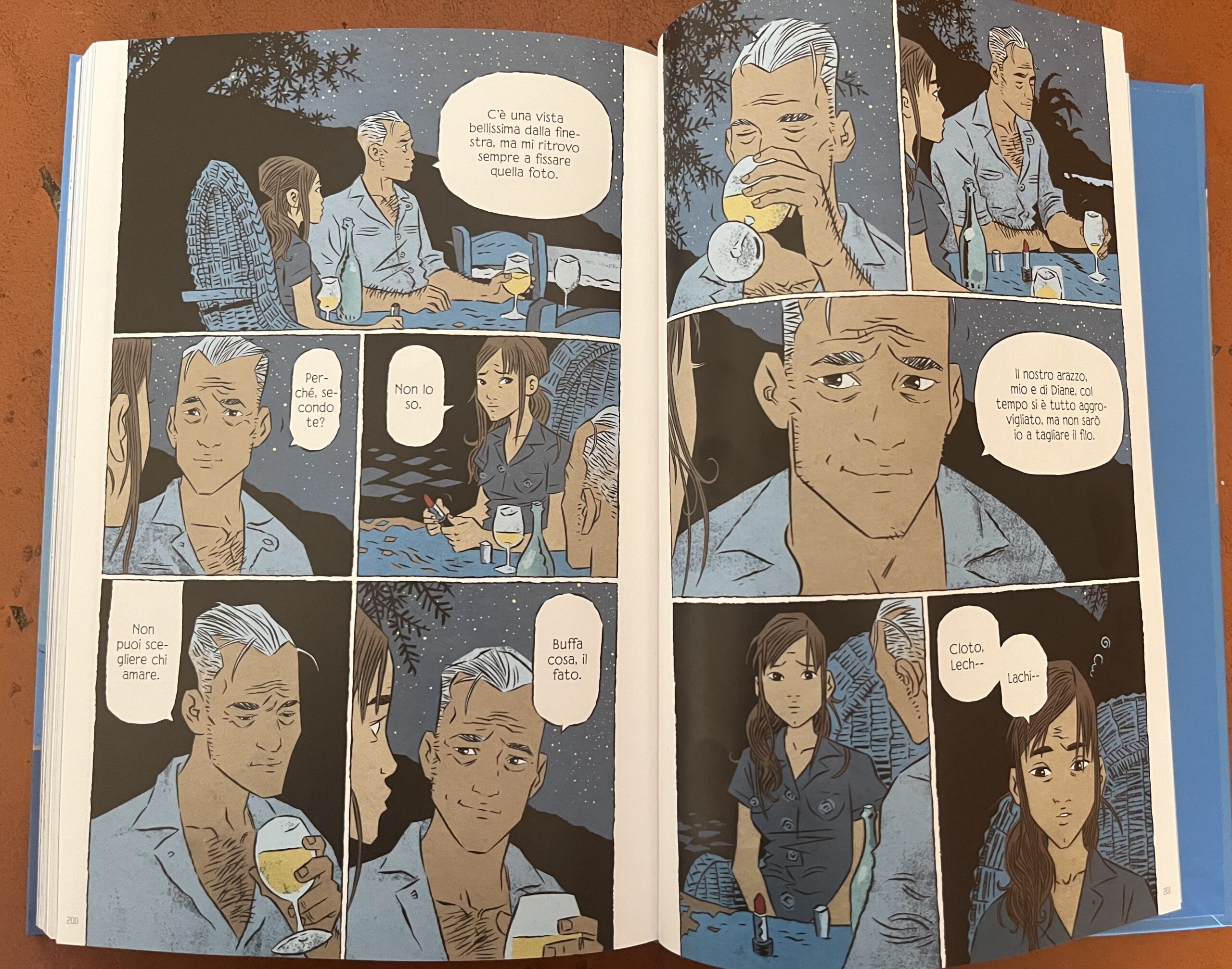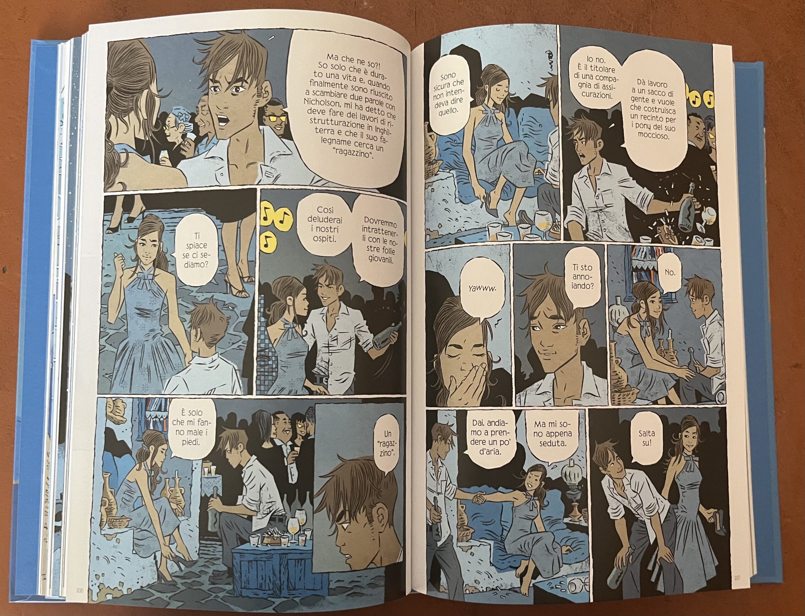 Infatti, siamo sin da subito travolti dalla magnificenza del tratto di Simon Gane. I suoi disegni si prestano perfettamente alle atmosfere riuscendo a catturare le emozioni dei protagonisti con un tratto vibrante ed espressivo. La colorazione pastello e bianco restituisce a pieno i colori delle isole greche dell’Egeo, nel loro essere sospese tra realtà e sogno, luogo di villeggiatura degli inglesi sin dal settecento e da qualche anno meta turistica ambitissima anche da noi italiani. Un tratto così bello ed emozionante da travolgere il lettore, a cui si abina una storia d’amore tra due adolescenti, talmente tanto bella e ben scritta, che non si riesce a resistervi. Così tanto vera che pur avvertendo che qualcosa non va, non si riesce a non immedesimarsi viaggiando con la mente a quando anche noi fummo adolescenti.