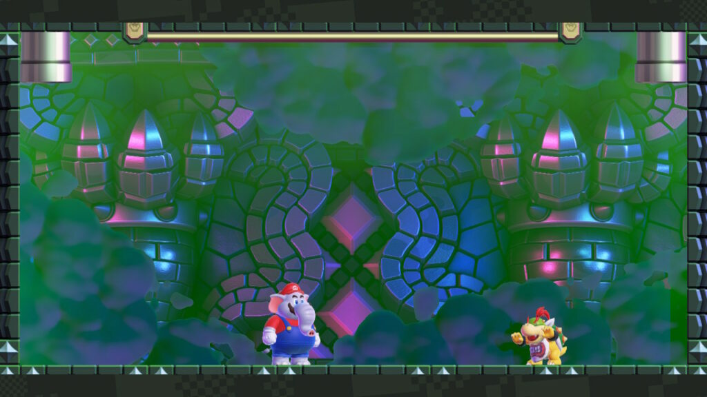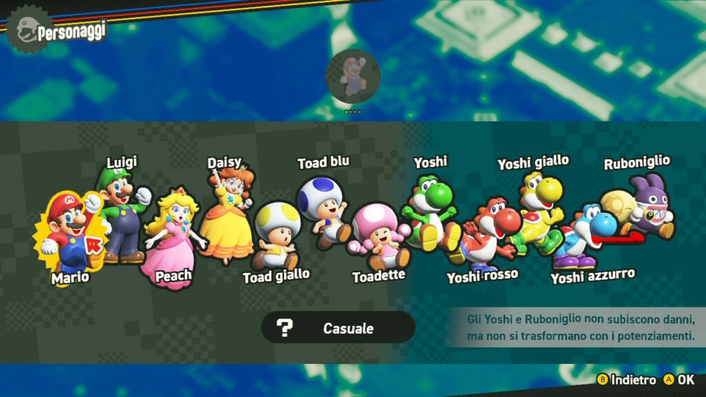 I personaggi giocabili di Super Mario Bros. Wonder sono ben 12, ma non tutti sono uguali. Oltre ai personaggi umani, possiamo scegliere di giocare come Yoshi (disponibile in quattro colori differenti) o come un Ruboniglio, entrambi invulnerabili ai danni nemici, ma impossibilitati all’utilizzo dei potenziamenti. Proprio tra questi potenziamenti possiamo vedere per la prima volta Mario Elefante, un potere che dona forza incredibile e la capacità di bere e spruzzare acqua. Proprio quest’ultimo particolare è molto importante, perché permette di scoprire segreti e monete se utilizzato sui fiori o di raffreddare le superfici più roventi. C’è anche Mario Trivella, un power-up che ci dona la capacità di nasconderci sotto terra, sia in quella che troviamo sotto di noi sia in quella sopra di noi all’interno delle caverne.