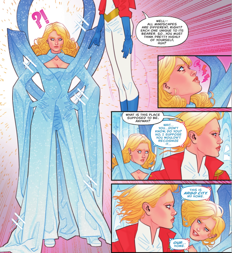 Nella storia, Kara si presenta a Omen e Power Girl con un problema che la porta a comunicare in una lingua diversa ogni volta che cerca di parlare ad alta voce. Per arrivare alla radice del problema, Power Girl e Kara si avventurano nella mente di Supergirl, che a quel punto debutta con un vestito assolutamente stupefacente. “Beh… tutti i paesaggi mentali sono diversi, giusto?”. commenta Power Girl. “Ognuno di essi è unico per il suo portatore. Quindi… devi avere un’ottima opinione di te stessa, eh?”.
