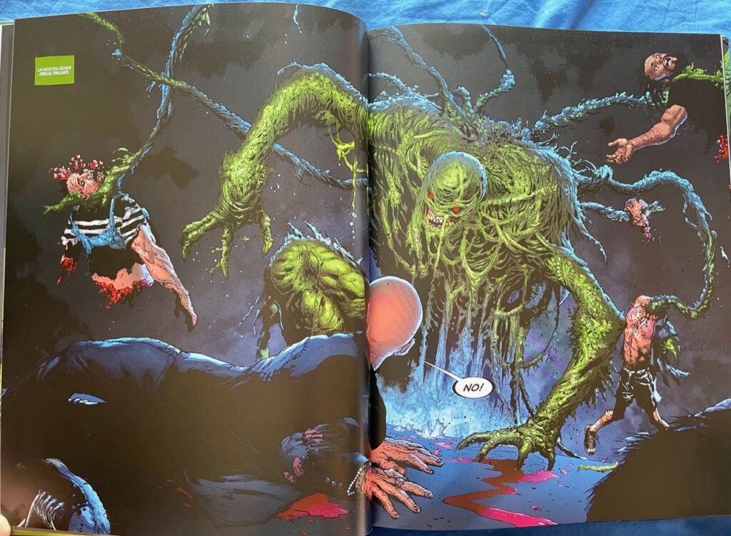 Swamp Thing: Inferno Verde è una storia ricca di creature mostruose e piuttosto violenta. La collocazione nella collana Black Label permette al team creativo di porsi meno limiti e raccontare una vicenda cruda, anche grazie alle tavole di Doug Mahnke. Con il suo solito stile ben riconoscibile, il disegnatore rende il tutto ancora più orrorifico, dando il meglio nelle scene d’azione e nei volti dei personaggi. L’espressione del nuovo avatar del verde è a dir poco agghiacciante e mostra benissimo l’assenza di umanità che muove la creatura. Pur condividendo il colore della pelle, questo è un altro dettaglio che lo distingue da Swamp Thing, disegnato sempre con un volto più “umano” e capace di provare diverse emozioni.