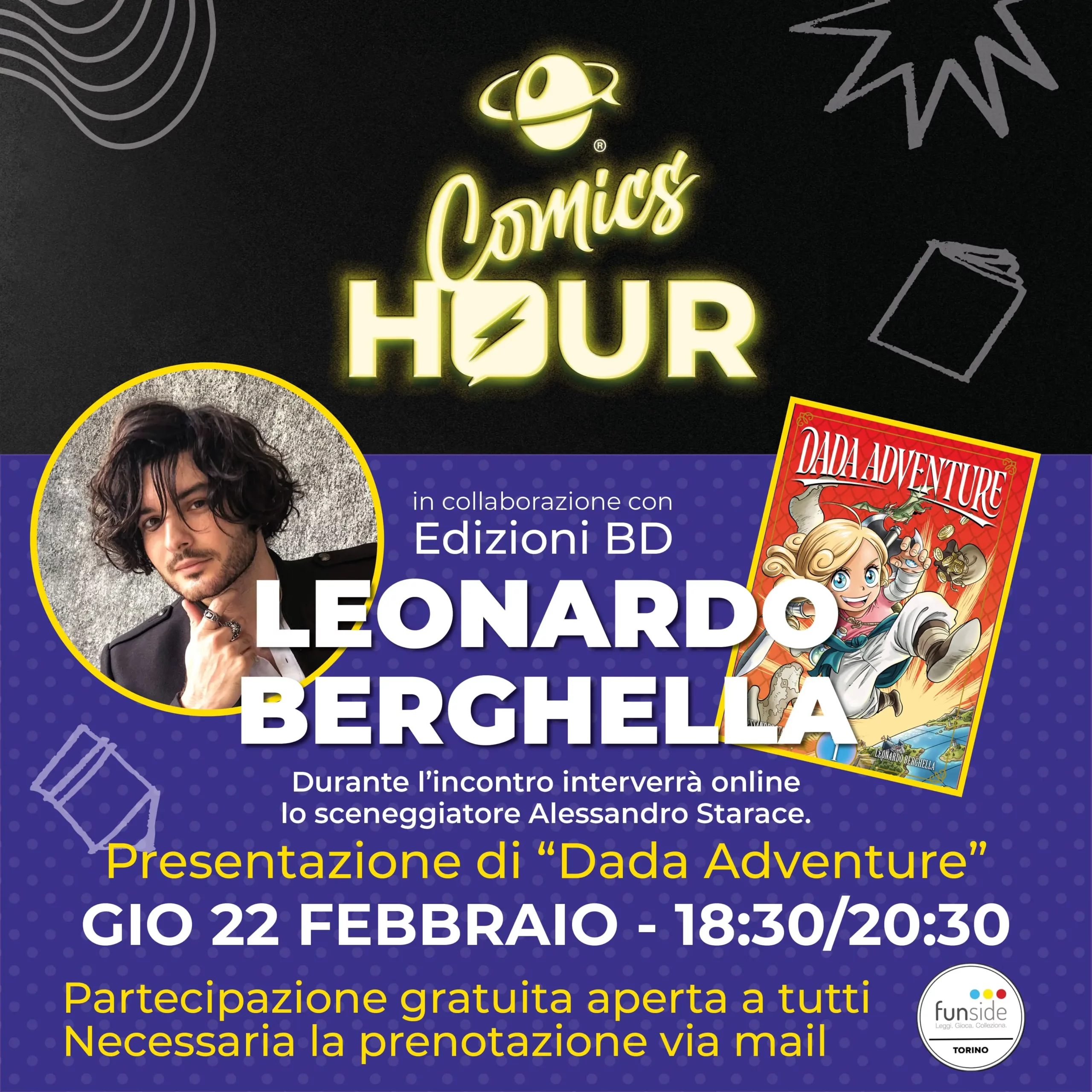 Il penultimo appuntamento di giovedì 22 febbraio alle 18:30, con ingresso libero, ha come ospite Leonardo Berghella, un giovane e popolarissimo autore, che con un euro-manga nato sui social e poi pubblicato da BD, sta spopolando tra i lettori più giovani, ma non solo. La serie in questione è DADA ADVENTURE e Leonardo Berghella ne parlerà col pubblico, fermandosi subito dopo a Scuola per una sessione di dediche. In collegamento online, sarà presente anche lo sceneggiatore Alessandro Starace.