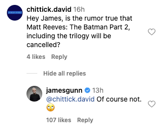 Mentre condivideva una foto della Fattoria Kent sul set di Superman, James Gunn è stato interrogato su una voce che riguardava il seguito di The Batman di Matt Reeves e la cancellazione della trilogia di Batman. Gunn ha risposto prontamente: “Certo che no”, con un’emoji che fa roteare gli occhi. Quindi, per il momento, sembra che si vada avanti a pieno ritmo con The Batman Part II e la sua uscita prevista per il 2026. Naturalmente, questa non è la prima volta che James Gunn ha dovuto commentare lo stato di avanzamento di The Batman – Part II. Potete dare un’occhiata allo scambio su Instagram qui sotto.