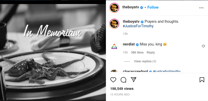 Il terzo episodio dell’ultima stagione di The boys, in onda su Amazon Prime video, si è concluso con una tra le sequenze più scioccanti di sempre. Dopo essere stato invitato da Patriota per una cena, l’onnipotente capo dei Sette di Antony Starr costringe Abisso di Chace Crawford a cenare con una prelibatezza Sud-Coreana: un polpo vivo. Dato che Abisso è un personaggio molto simile ad Aquaman, dotato quindi della capacità di comunicare con la fauna marina, non solo sapeva che quel Polpo si chiamava Timothy, ma riusciva anche a sentirlo chiedere pietà per la sua vita. La sequenza si conclude con Abisso che, alla fine, mangia Timothy sotto l’obbligo imposto di Patriota. Ora la pagina Instagram di The Boys ha pubblicato un video speciale solo per lui.