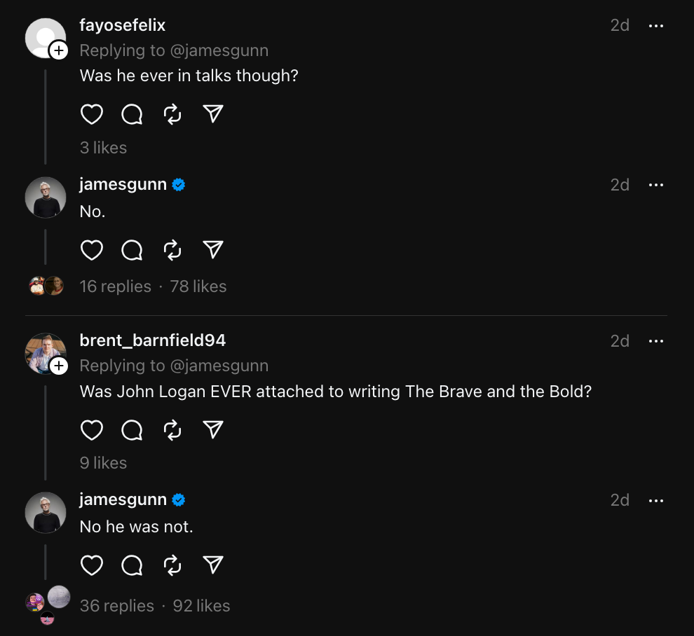 Gunn si è recentemente rivolto a Threads per rivelare che, nonostante rapporti e voci lo suggeriscano, John Logan, ex membro di The Aviator e Skyfall, non era legato o in trattative per scrivere The Brave and the Bold.