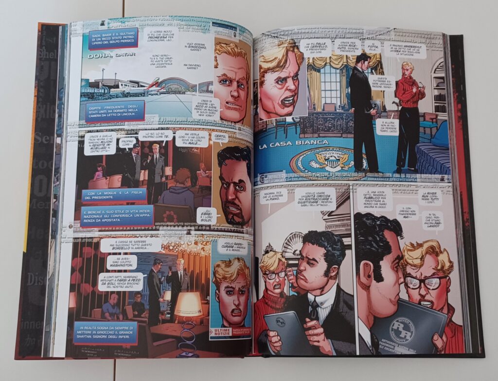 L’approccio narrativo di Chaykin, come gia detto, è sorprendentemente intricato. Dal punto di vista visivo, il volume è puro caos, un caos voluto, in un modo davvero difficile da spiegare. Le pagine sono piene di testo, parolacce, estratti di contenuti dei social media e preghiere. Una cosa che ha attirato molto la mia attenzione e che i cieli sullo sfondo di quasi tutte le location americane sono pieni di droni armati, o aerei da guerra, il che da sempre uno strano senso di ansia mentre si legge la storia. Il dialogo si muove costantemente, spostando spessissimo l’attenzione del lettore verso l’economia, la politica o la criminalità.