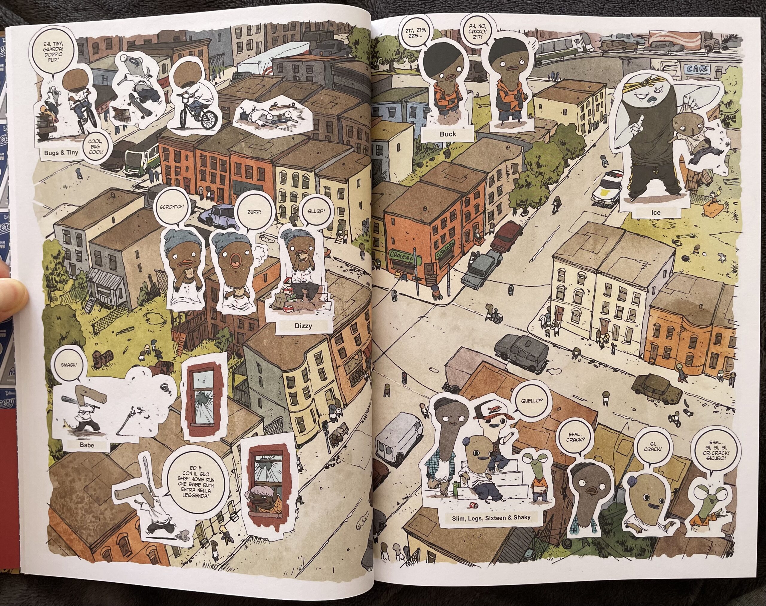 Il tratto molto particolare di Singelin è davvero perfetto per il racconto e rende benissimo questa doppia anima di The Grocery. Da un lato ci sono i personaggi, stilizzati e bizzarri nell’aspetto con le loro testone giganti e di varie forme, che in qualche caso potrebbero sembrare teneri a prima vista ma che si rivelano di una violenza inaudita. Dall’altro, l’ambientazione è resa in maniera molto precisa, quasi a dare l’idea di leggere un reportage giornalistico.